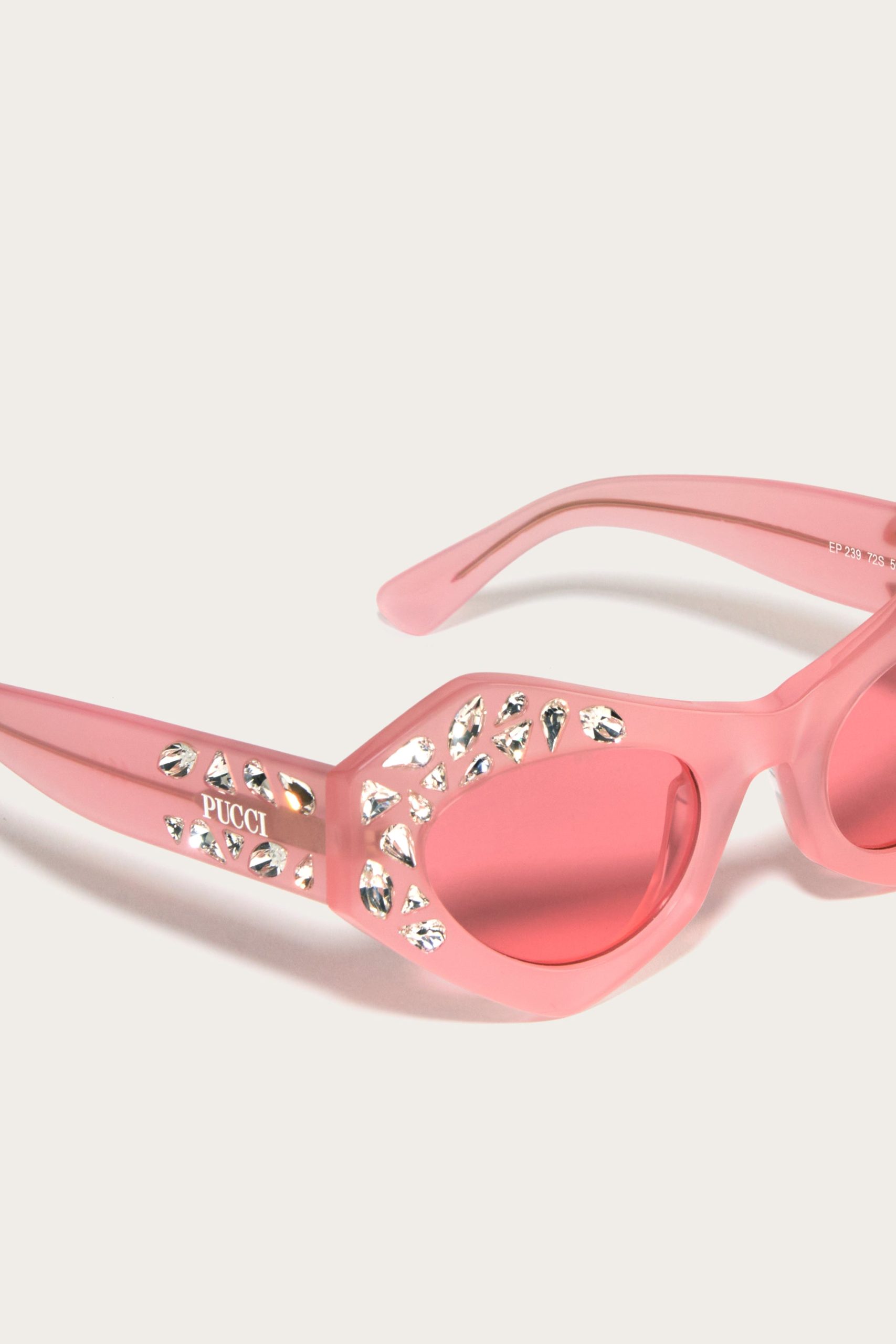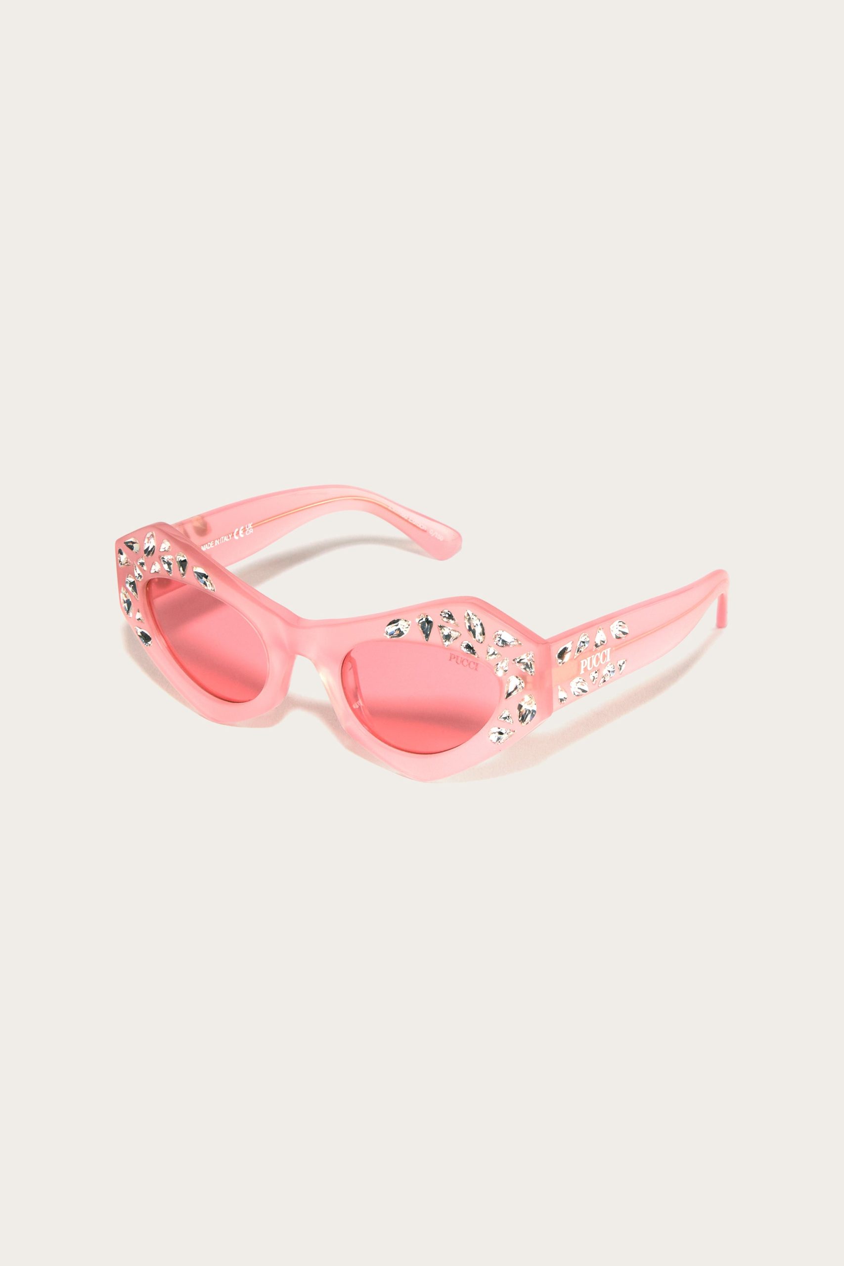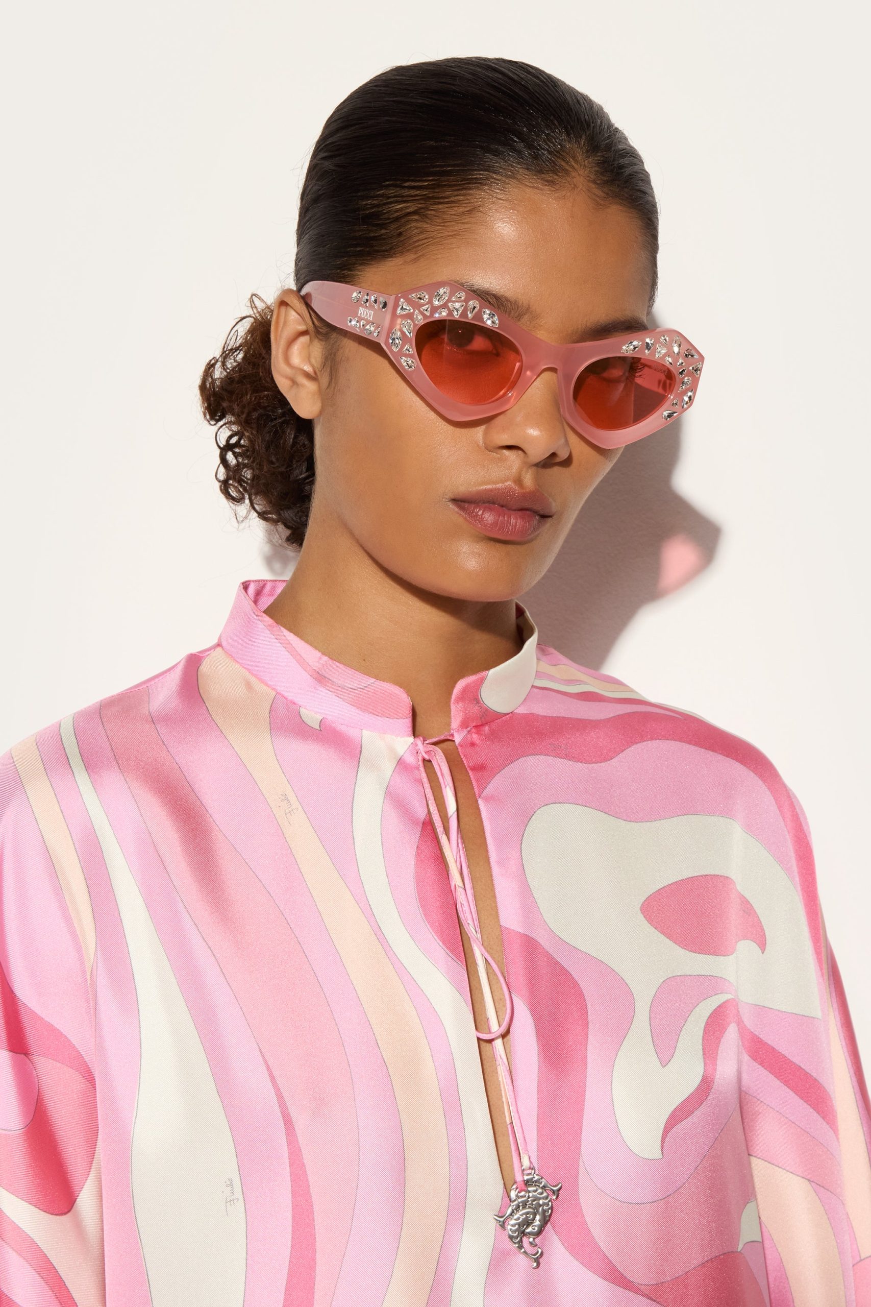 An accessory with a glam spirit, bold and irresistibly distinctive. These cat-eye sunglasses are characterized by a tortoiseshell acetate frame, embellished with a geometric decoration of applied rhinestones in relief, which enhances the angular shape and gives luminosity.The design is enhanced by thick temples with engraved logo, which reinforce the model’s bold character. Gradient lenses add a vintage-chic touch, perfect for those who want a sophisticated and dramatic look with the unmistakable Pucci touch.