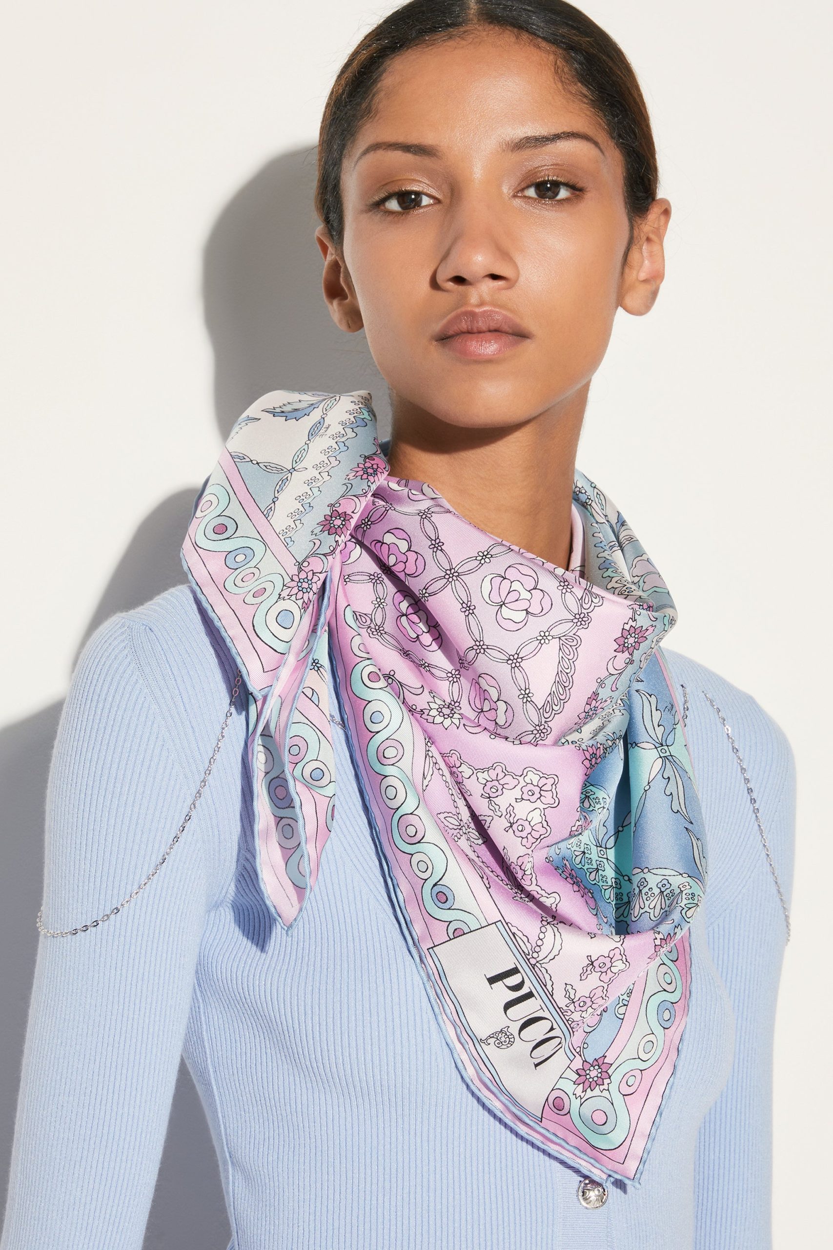 The Festa print crisscrosses this silk-twill carré with neat floral motifs. The house moniker and intertwined fish motif complete the versatile design, which can be worn as a head covering, neck scarf, belt or sarong.