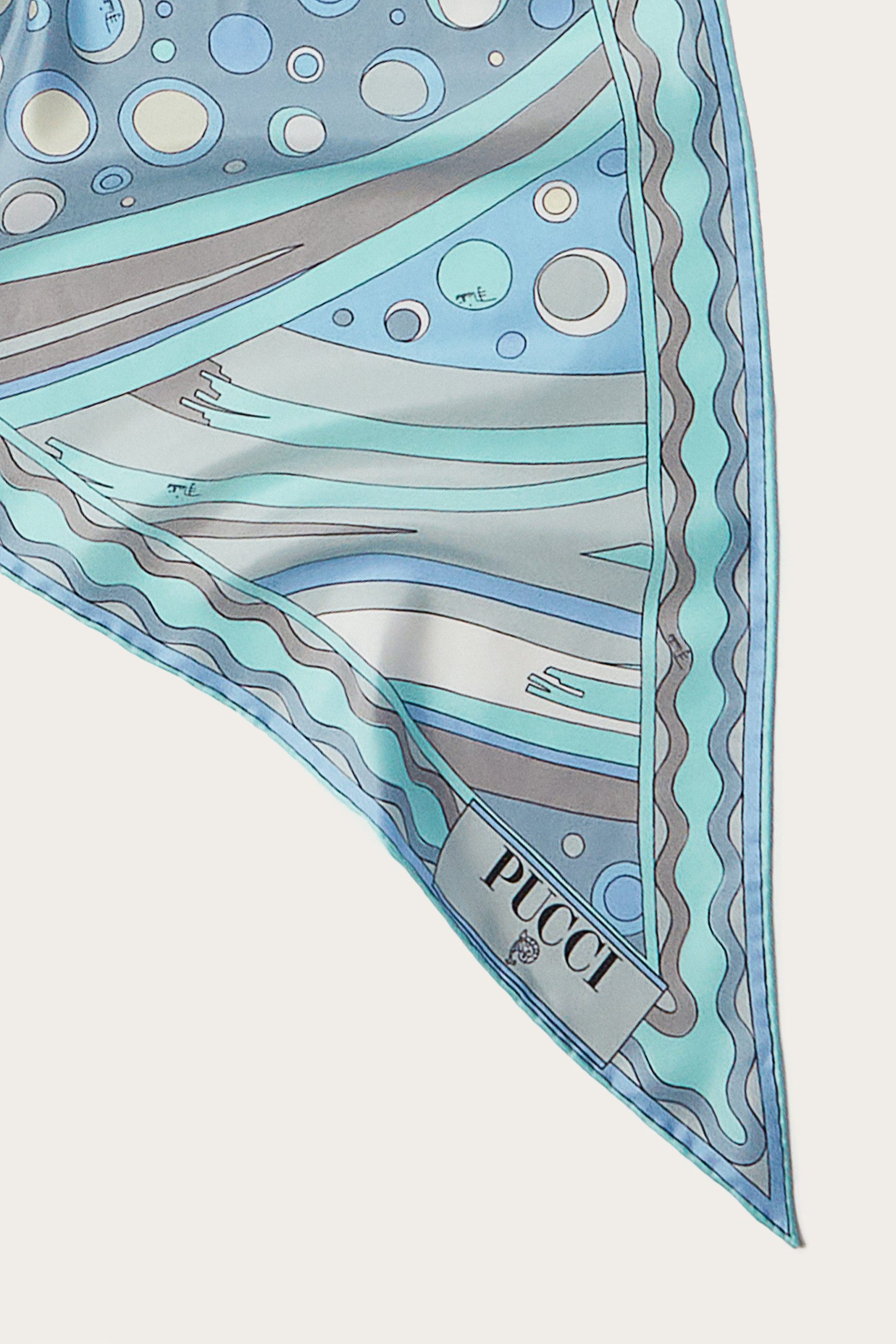 The effervescent Fontane print covers this silk-twill scarf in bubbling spheres and splashing curves. The design is complete with a moniker and intertwined fish symbol and can be knotted around the head, styled as a top or tied to a bag.