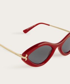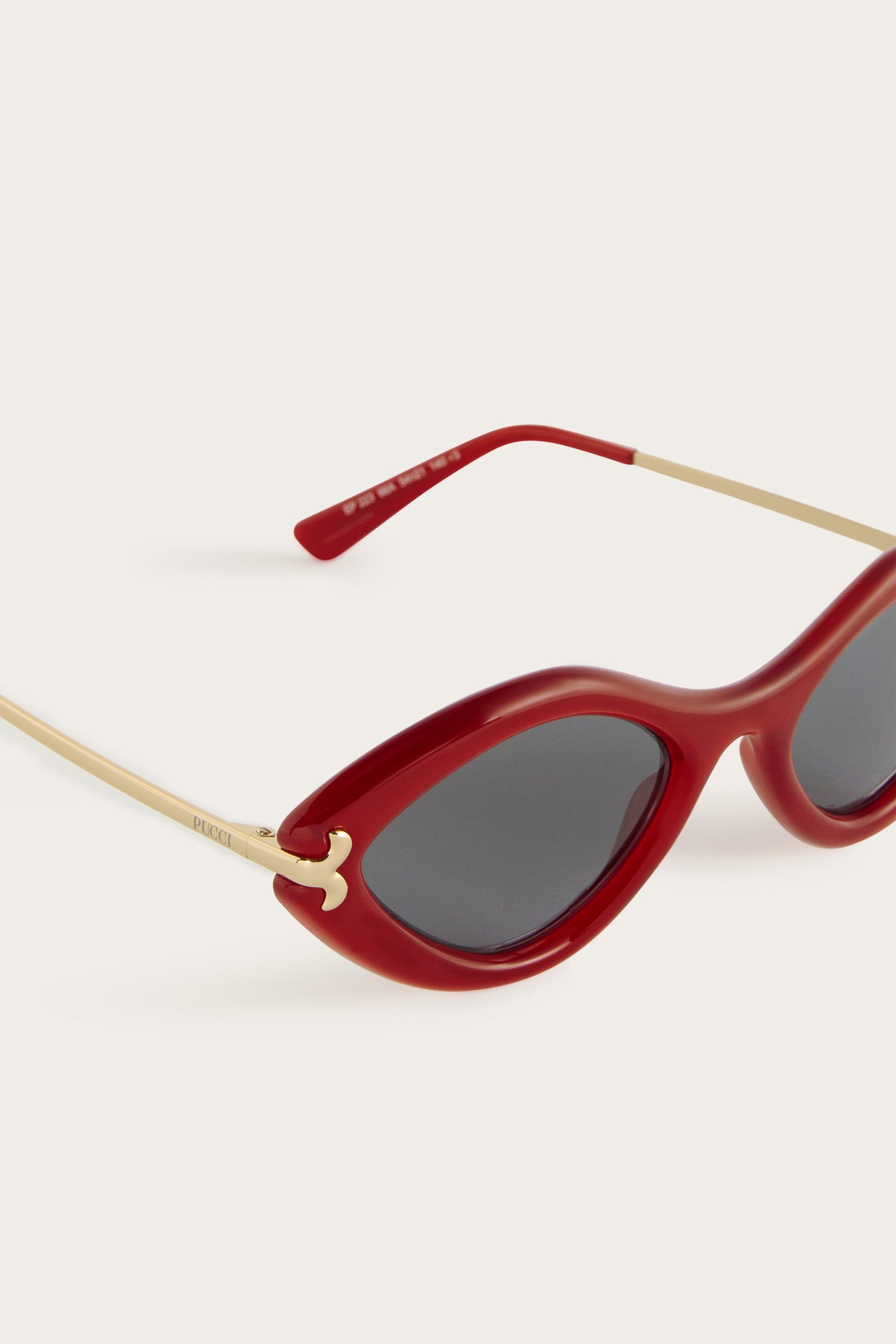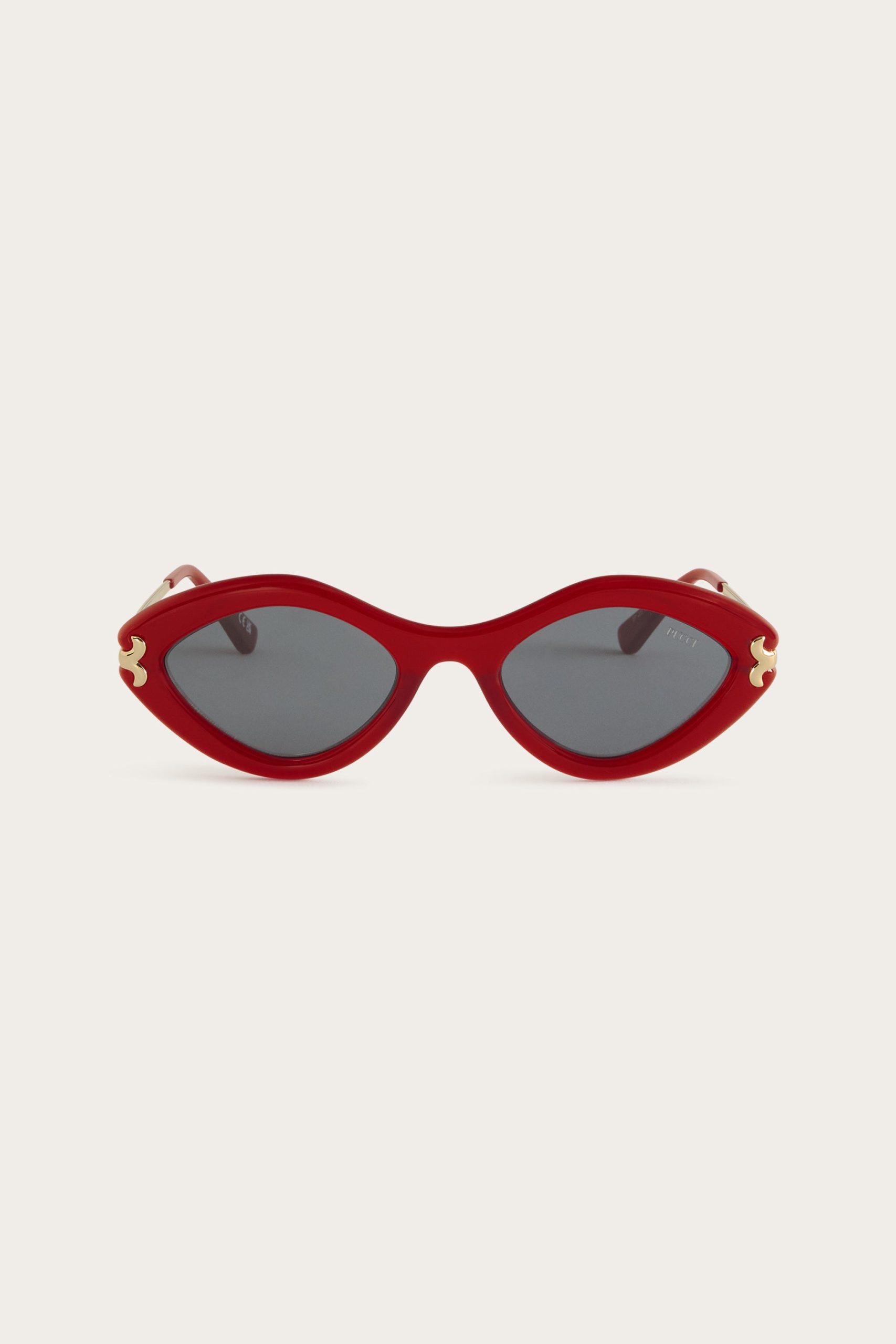 Decisive, bold and sculptural in character. This variant of the Pucci Fishtail glasses comes in a contemporary and eye-catching geometric shape, made of red glossy acetate. The rounded frame gives three-dimensionality to the design, while the rounded fishtail-shaped metal details create an elegant junction between the front and temples, enhancing its iconic nature. The contrast between the solid acetate frame and the thin metal temple – enhanced by a laser-engraved Pucci logo – expresses a sophisticated and instantly recognizable aesthetic.