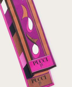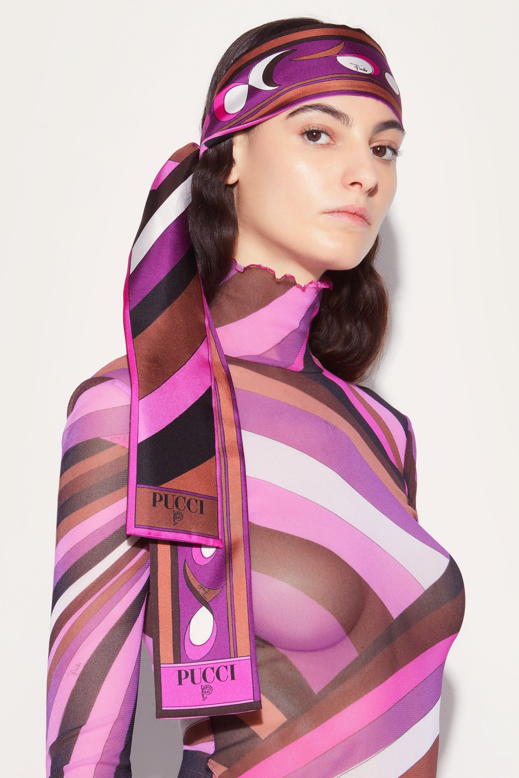 Awash in opulent purple and brown hues, this silk-twill scarf features the artistic Pesci and elliptical Iride prints. The house moniker and intertwined fish motif complete the slim design, which can be worn at the neck, as a headband or belt.