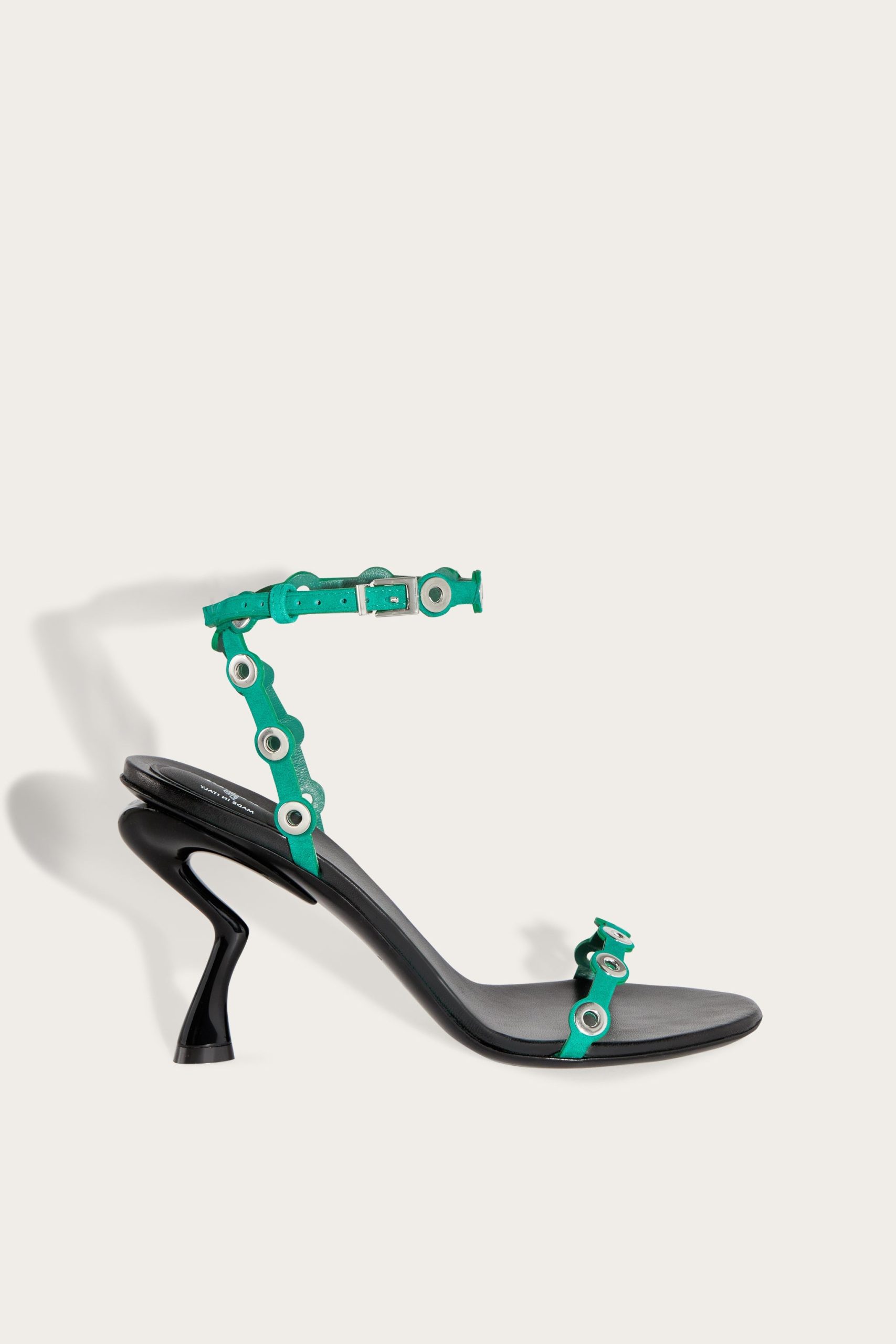 A sandal that speaks of elegance and character: with its sophisticated design and sleek heel, it can become the ideal companion for special evenings, exclusive events or simply to add a touch of glamour to your everyday looks. The suede upper is embellished with micro metallic studs that catch the light with every step, creating a unique visual effect.The adjustable buckle closure on the strap ensures a perfect and comfortable fit.