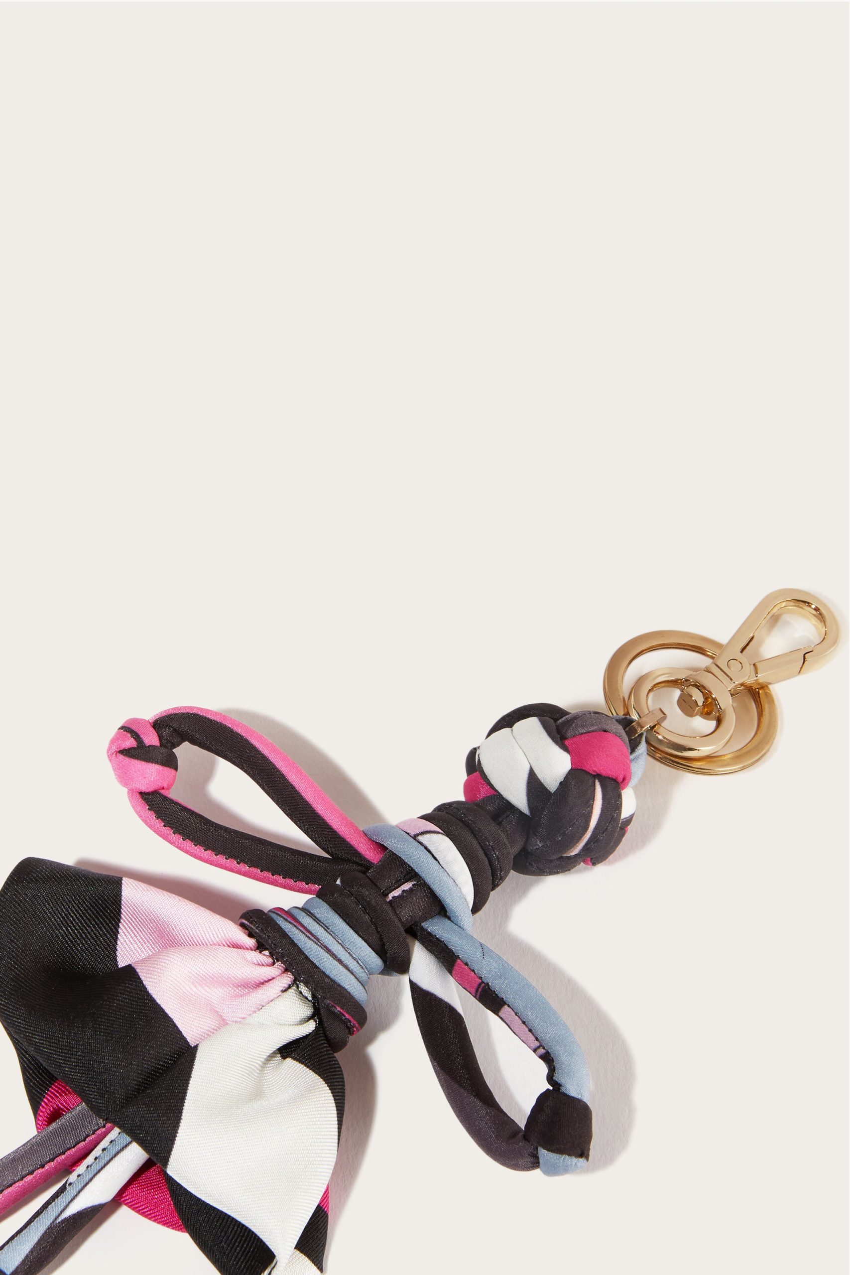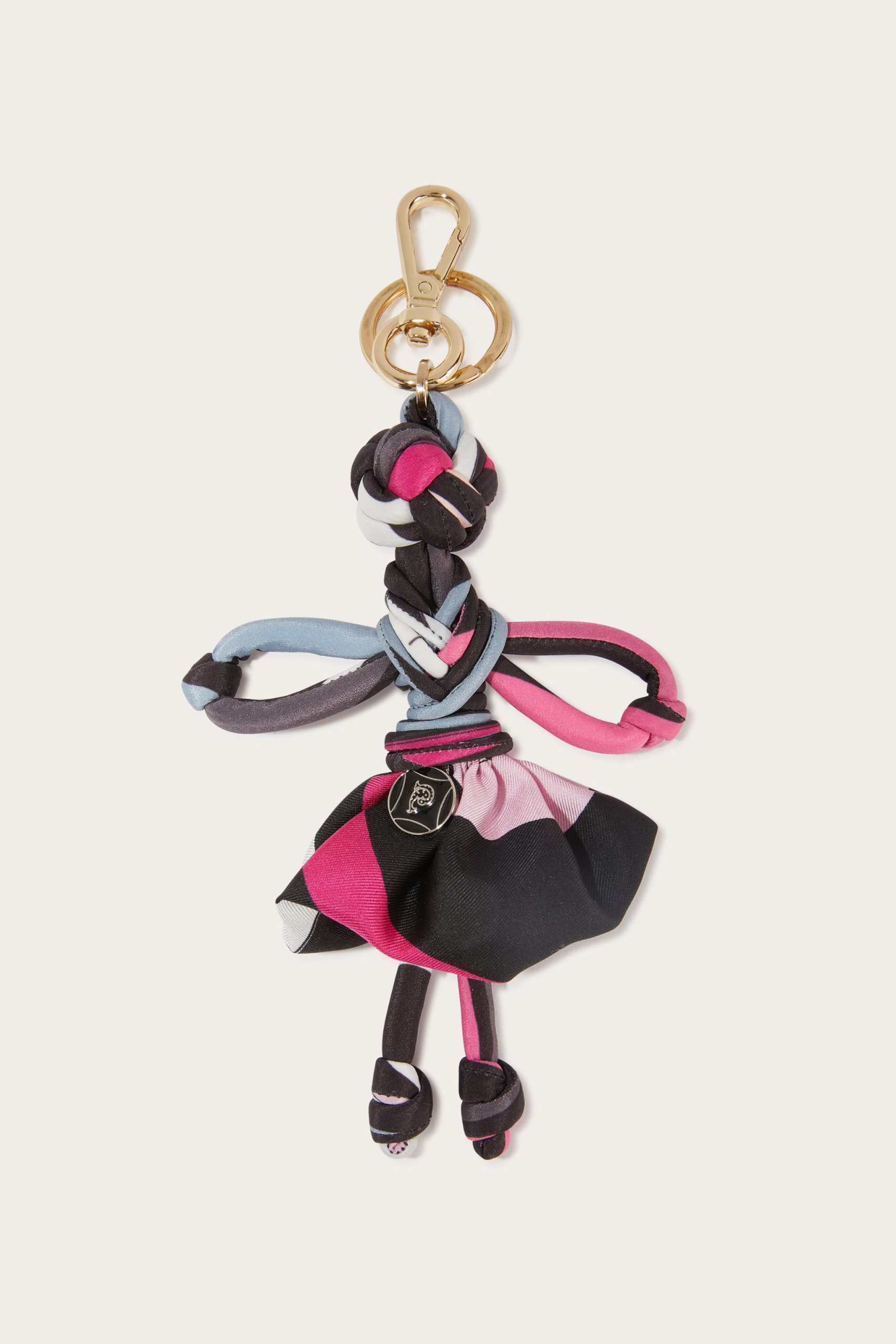 A small detail that encapsulates all of Pucci’s vibrant spirit. This doll keychain is made of woven silk, decorated with the iconic Iride print in refined shades of black and fuchsia.Perfect for adding a distinctive touch to keys or as a decorative charm for handbags, it is an accessory that combines craftsmanship and playful design. A true collector’s piece designed for those who love unique and sophisticated details.