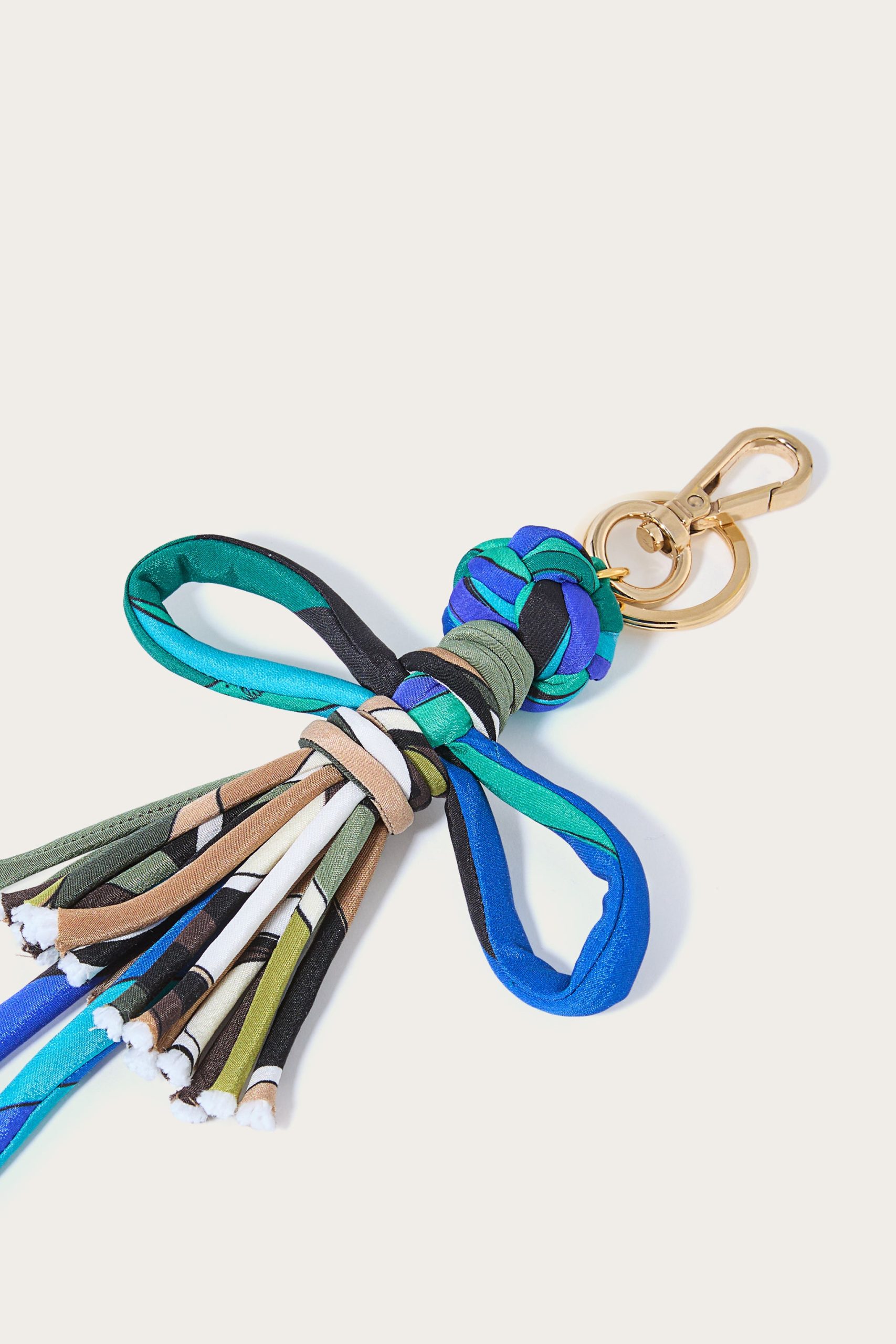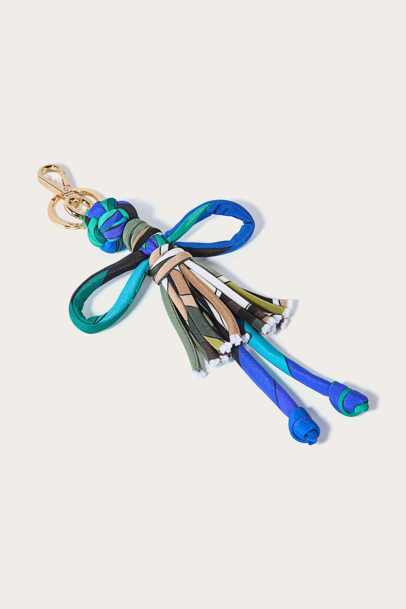 A small detail that encapsulates all of Pucci’s vibrant spirit. This doll keychain is made of woven silk, decorated with the iconic Iride print in refined shades of emerald and khaki.Perfect for adding a distinctive touch to keys or as a decorative charm for handbags, it is an accessory that combines craftsmanship and playful design. A true collector’s piece designed for those who love unique and sophisticated details.