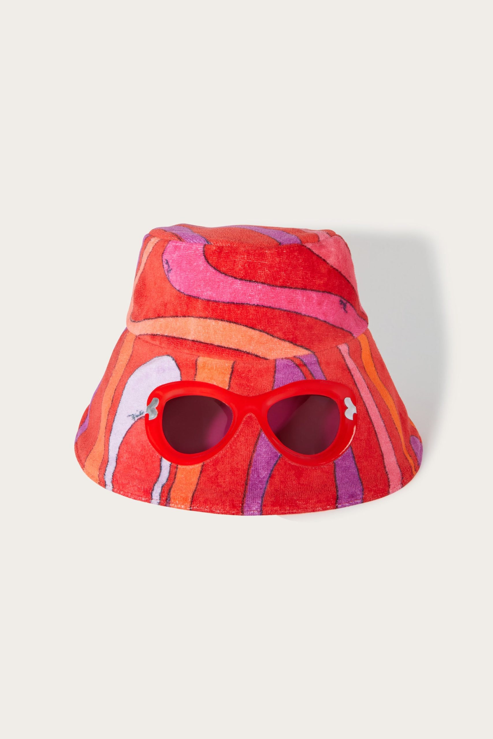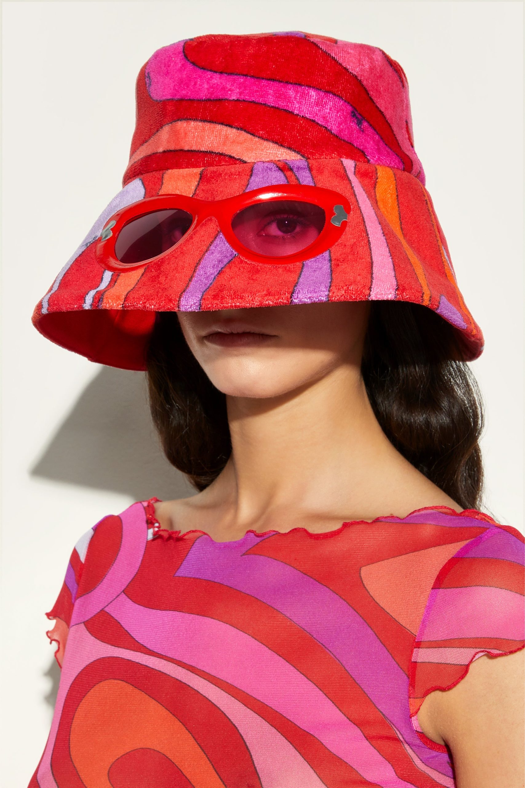 The printed terry cloth bucket hat is the perfect accessory to add a touch of personality and originality to your summer looks. Ideal for protecting you from the sun but also from the prying eyes of fans and onlookers, it combines a functional design with unique details that can’t go unnoticed, however.The iconic Marmo print in vibrant coral and fuchsia hues recalls the vibrant energy of summer, while the decorative PVC sunglasses detail gives this accessory a playful and contemporary character, perfect to pair with light kaftans, summer dresses or sporty looks.