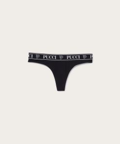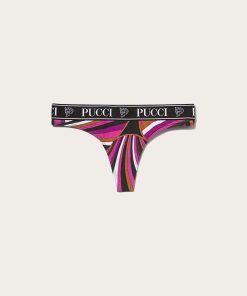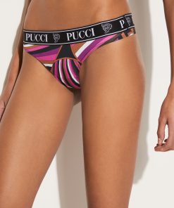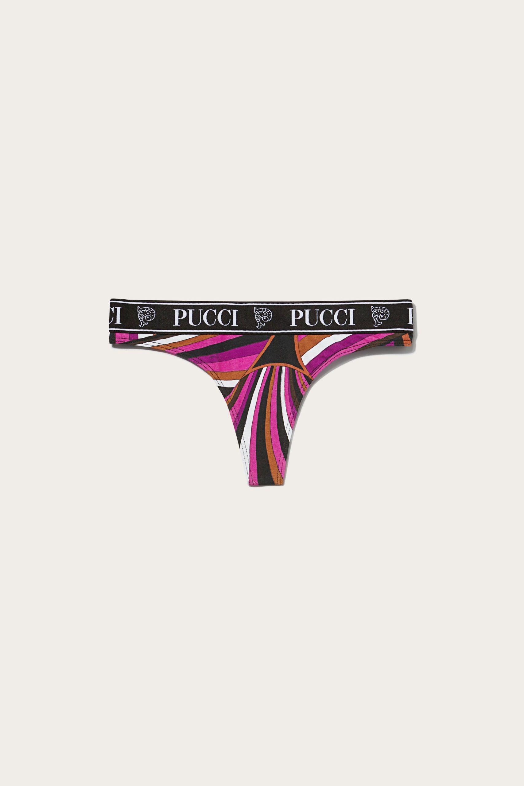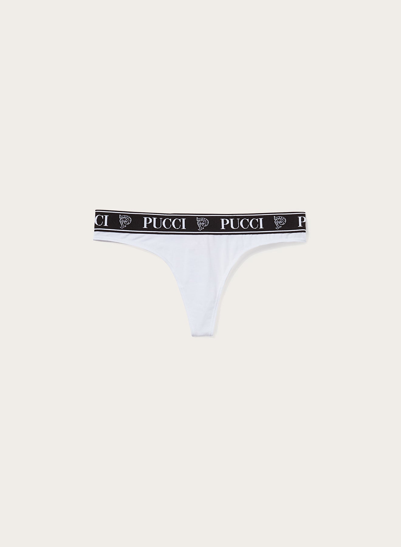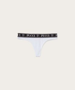 The thongs in this pack are fitted with an elastic waistband that’s jacquard-woven with the house’s moniker and Pucci P motif. One is decorated with the Iride print, while the others come in white and black.