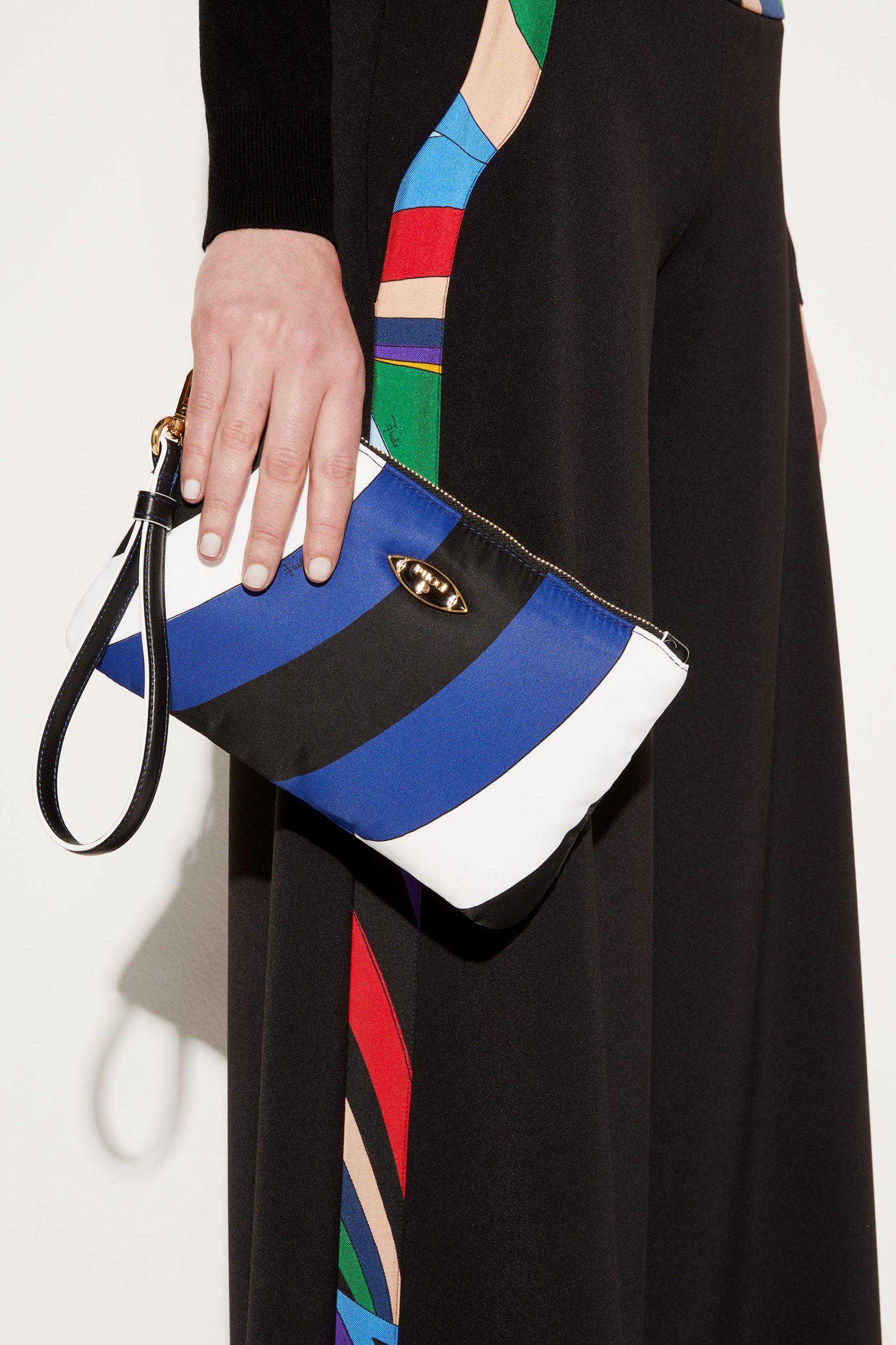 Pucci’s rippling Iride print envelops this clutch bag in bold hues. The compact design is finished with smooth leather trims and a vintage-inspired Pesci logo plaque at the front.
