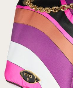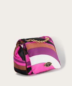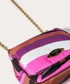 This nylon cross body bag is splashed with the fragmented Iride print in brown and purple hues. It hangs from a gold-tone chain-link shoulder strap that matches the Pesci logo plaque at the front.