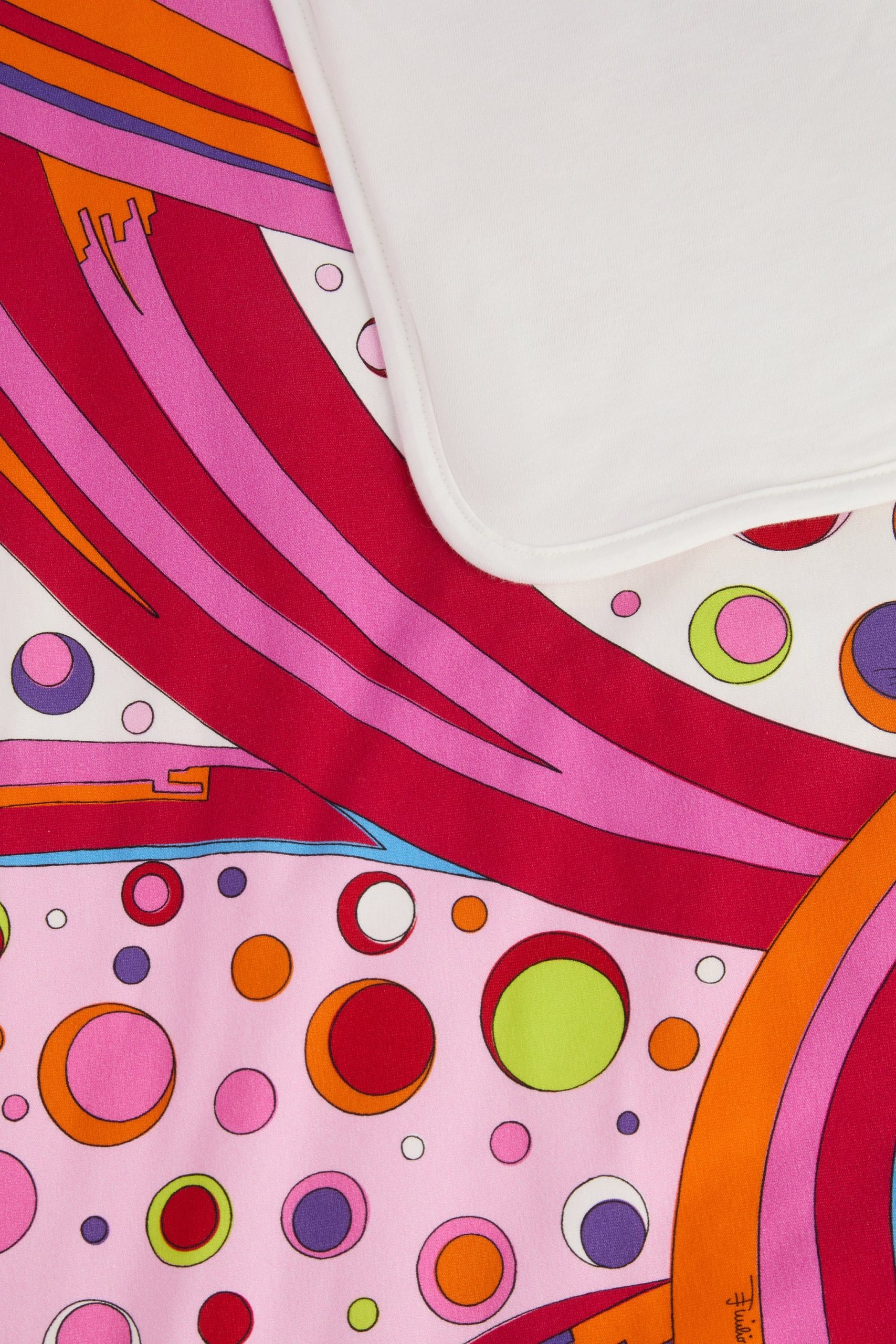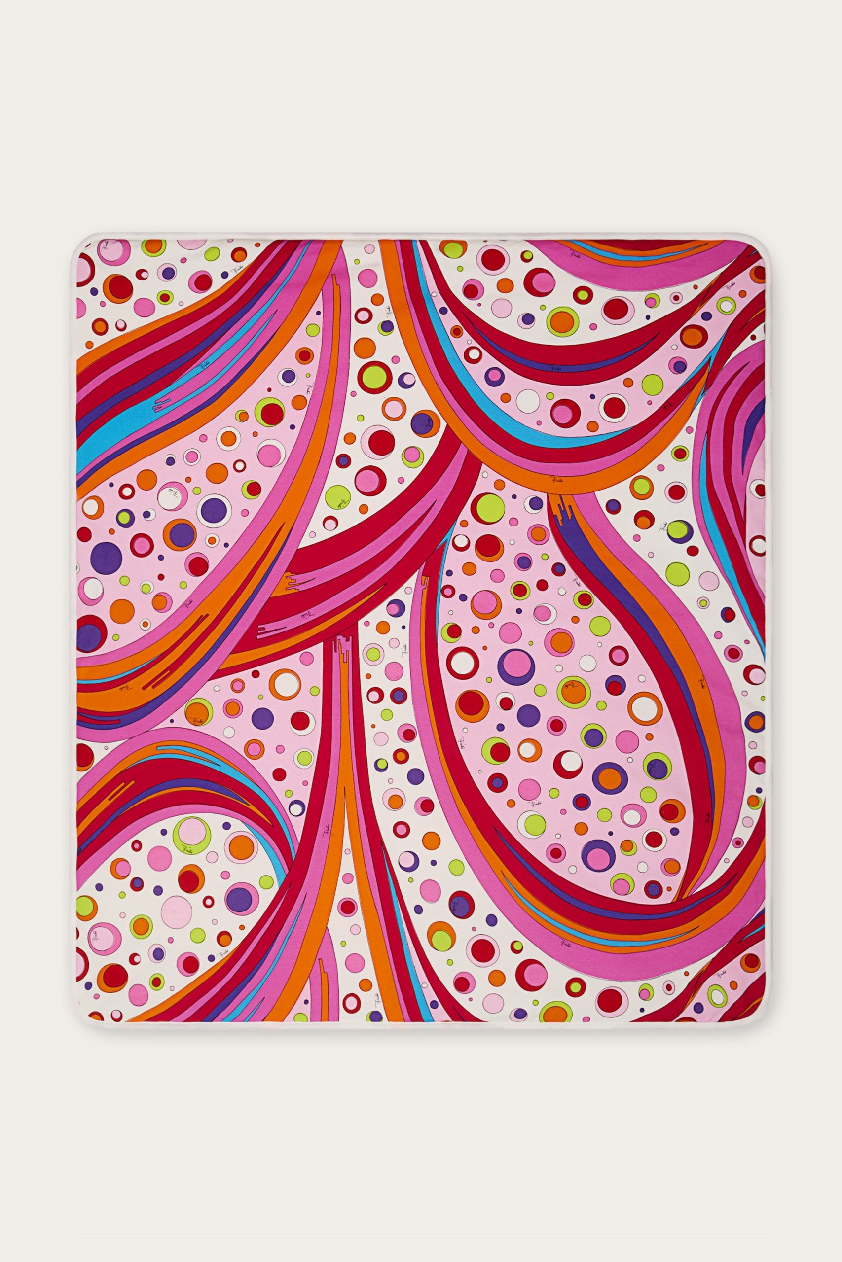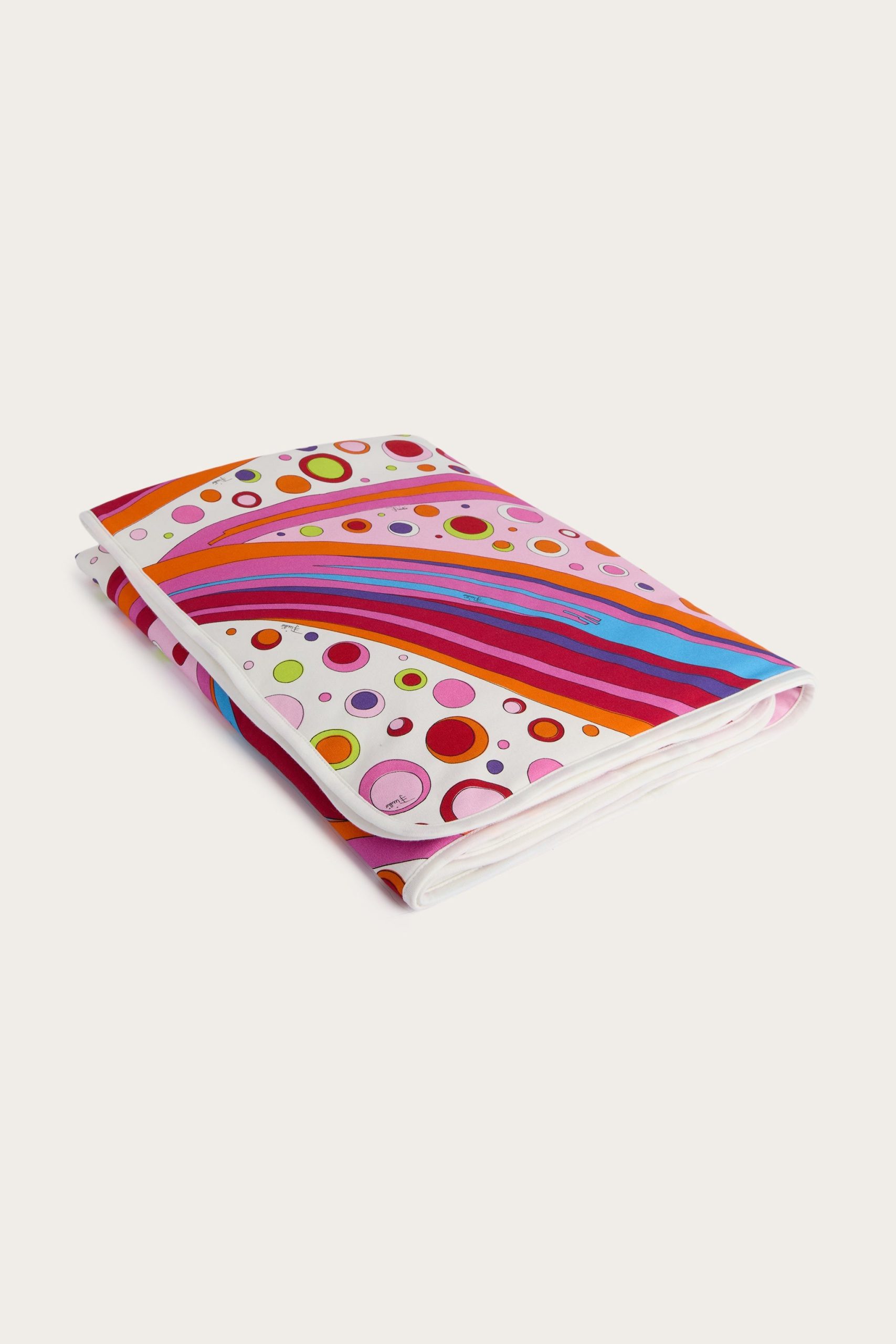 Wrapping like a cuddle, this stretch jersey baby blanket is designed to provide comfort and softness from the first days. The Fontane print in orange and multicolor dresses the garment with energy and tenderness, signing even the most tender moments with Pucci’s unmistakable touch.Perfect for the baby carriage, the crib or a relaxing moment in your arms, it is a practical and colorful accessory to always carry with you.