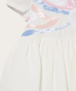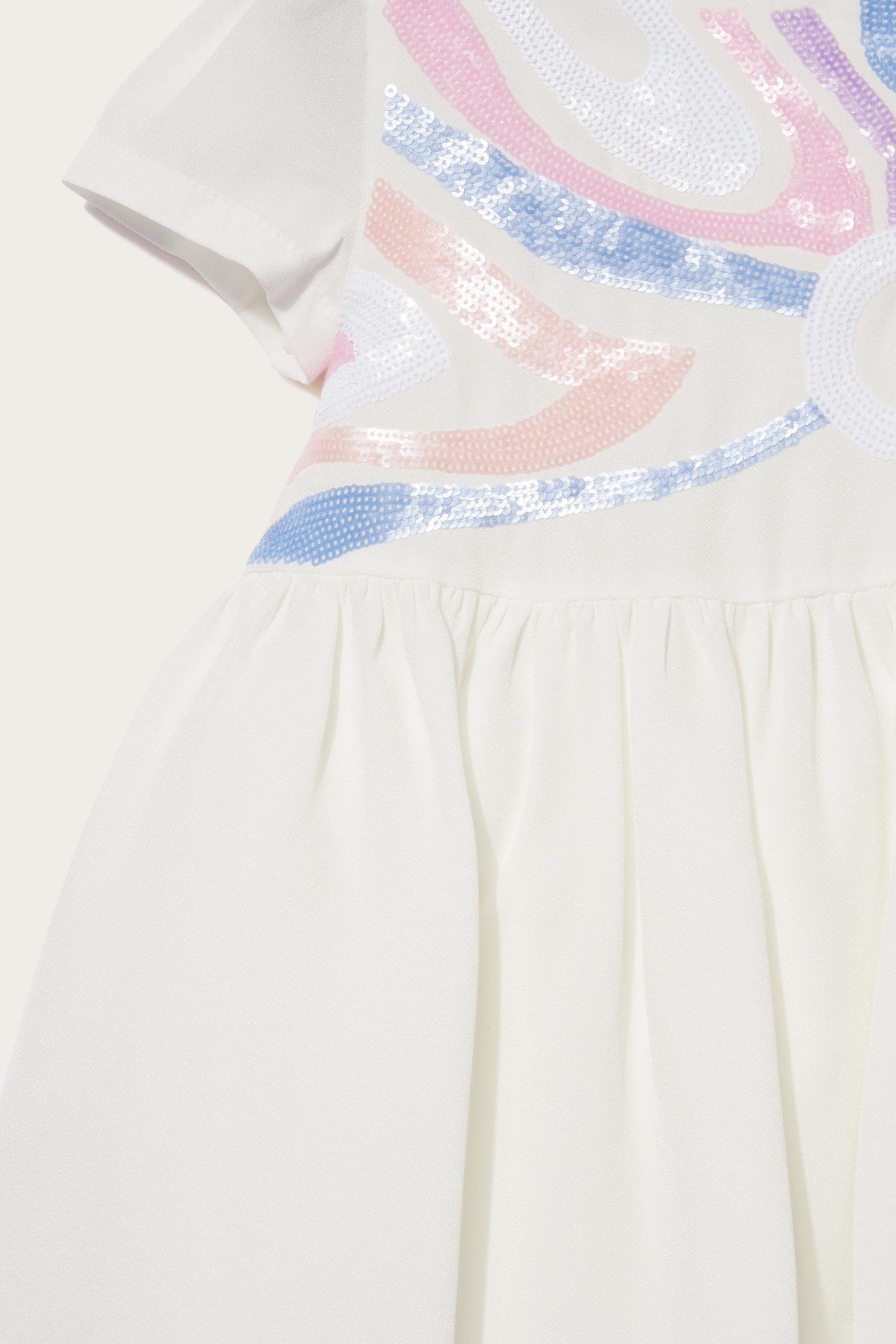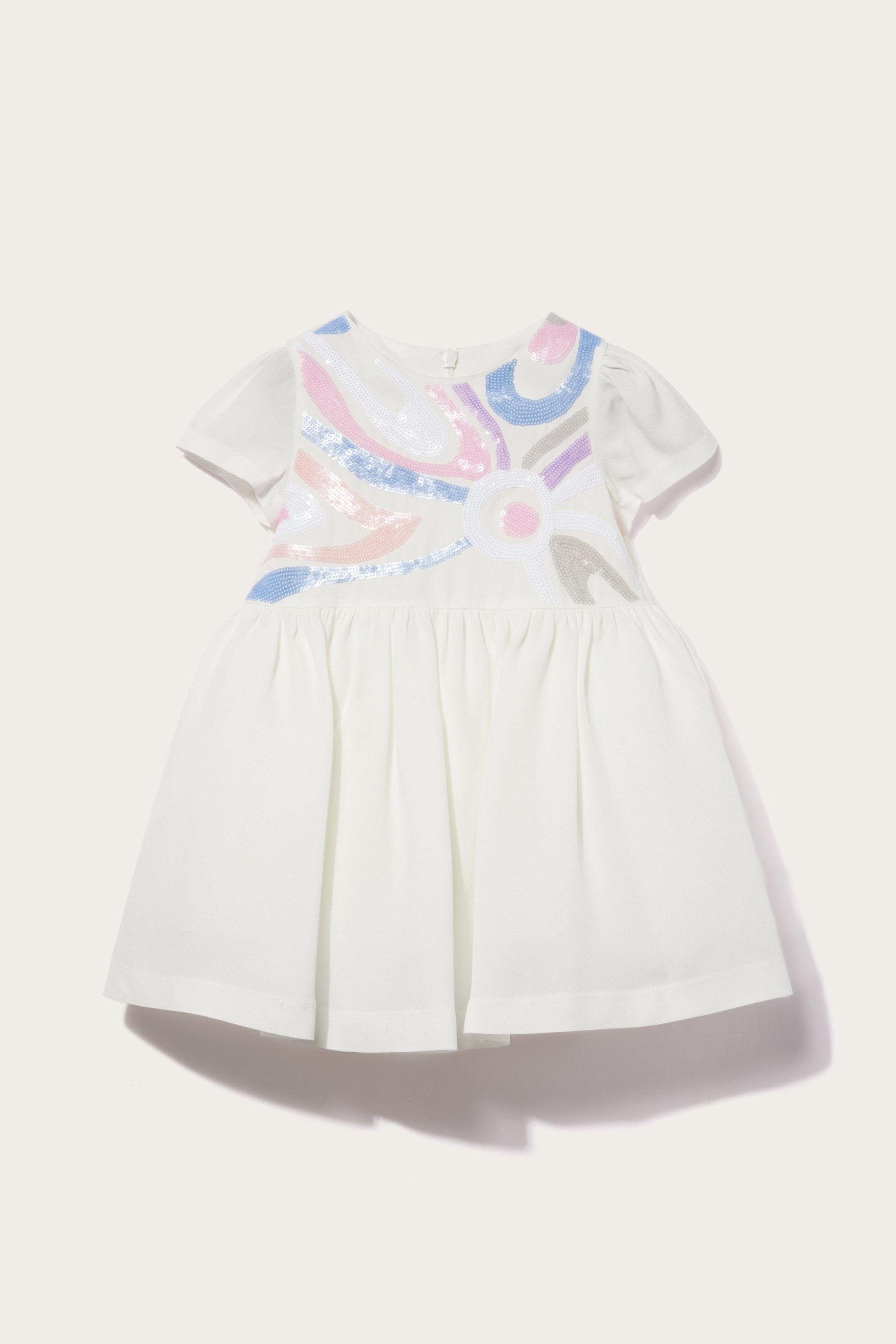 This dress brings Pucci’s colourful heritage into the here and now: an array of sequins is artfully arranged to mimic the archival Marmo print on the front. The zip fastening at the back ensures easy on and off.