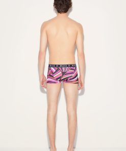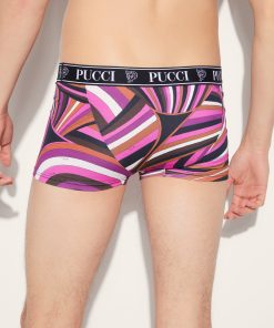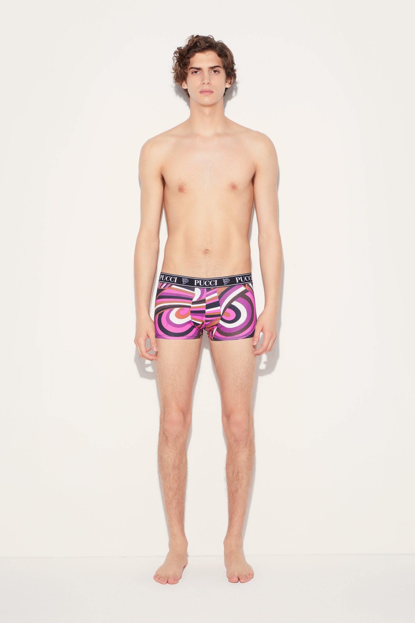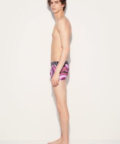 The trunks in this pack are fitted with an elastic waistband that’s jacquard-woven with the house’s moniker and Pucci P motif. One is decorated with the Iride print, while the others come in white and black.