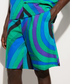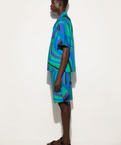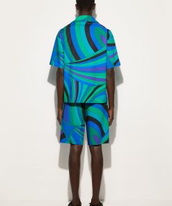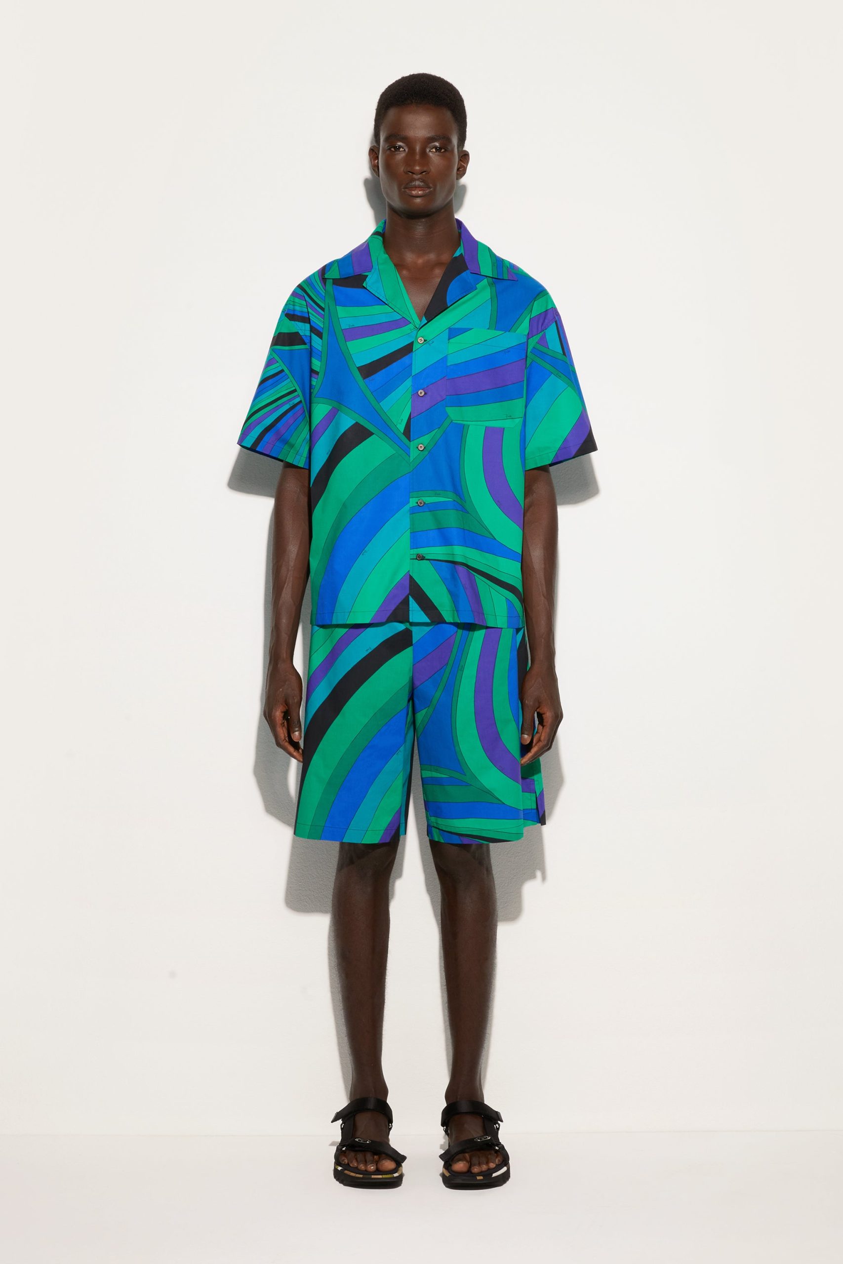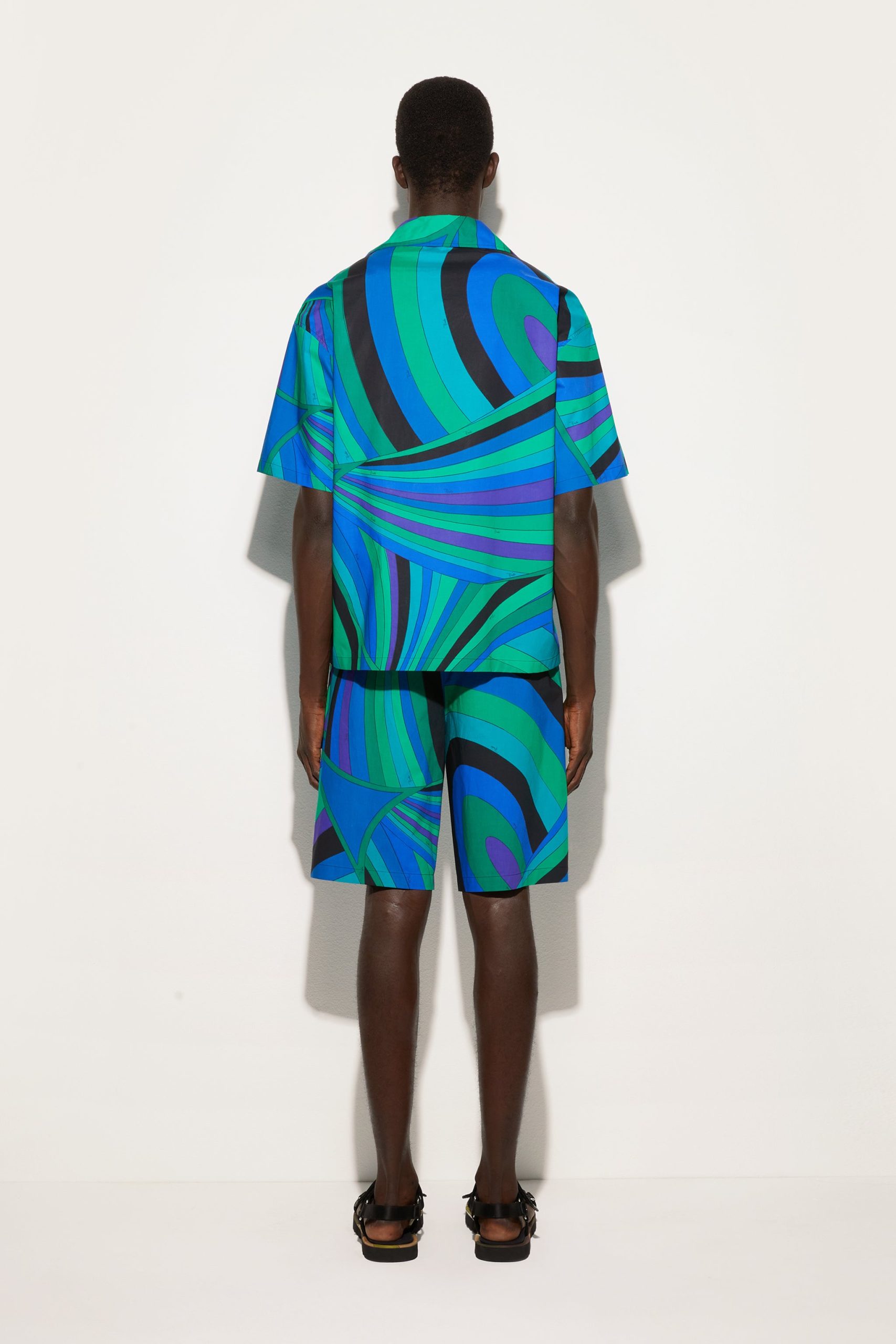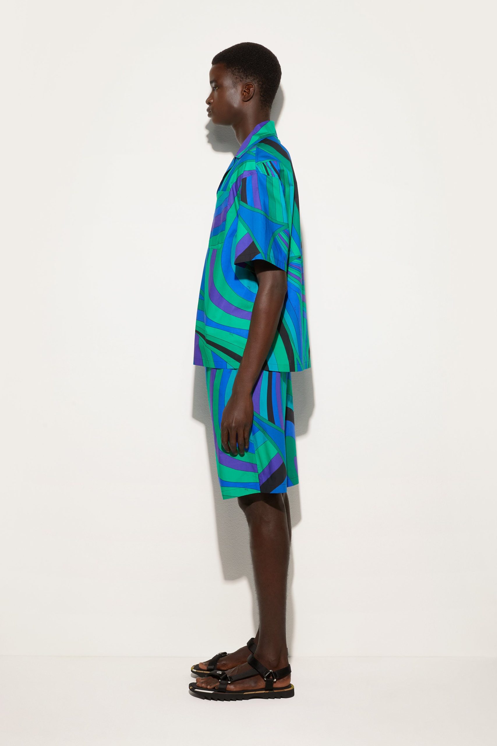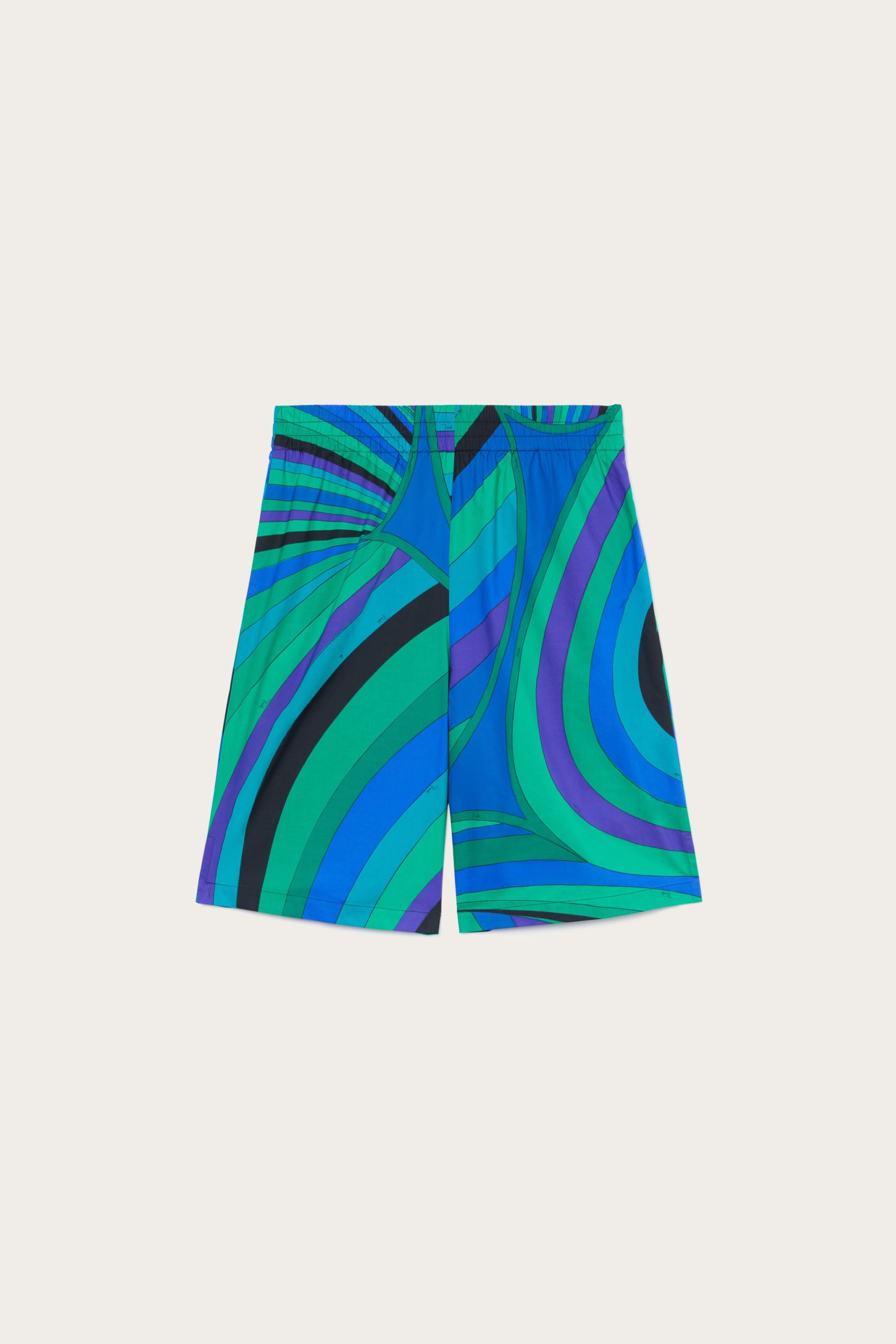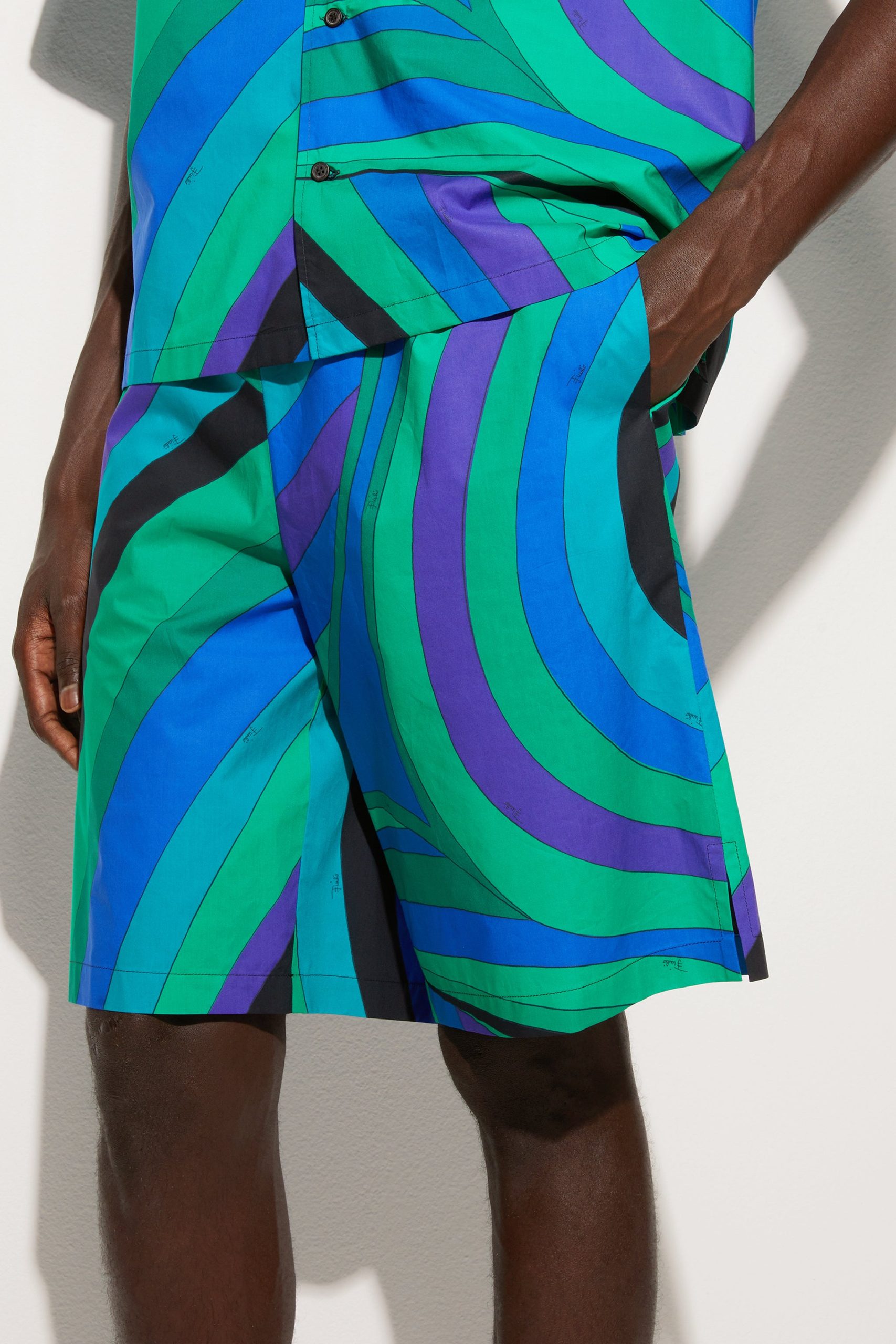 Clean lines and a relaxed fit define these loose, boxy shorts designed to offer comfort and style. The structured design, with a length that reaches just below the knees, gives a modern and versatile look.Made of 100% cotton, they provide lightness and breathability, perfect for leisure wear. The Iride print in emerald adds a distinctive touch, enhancing the graphic and dynamic character typical of the Pucci aesthetic.