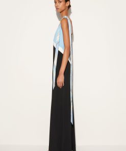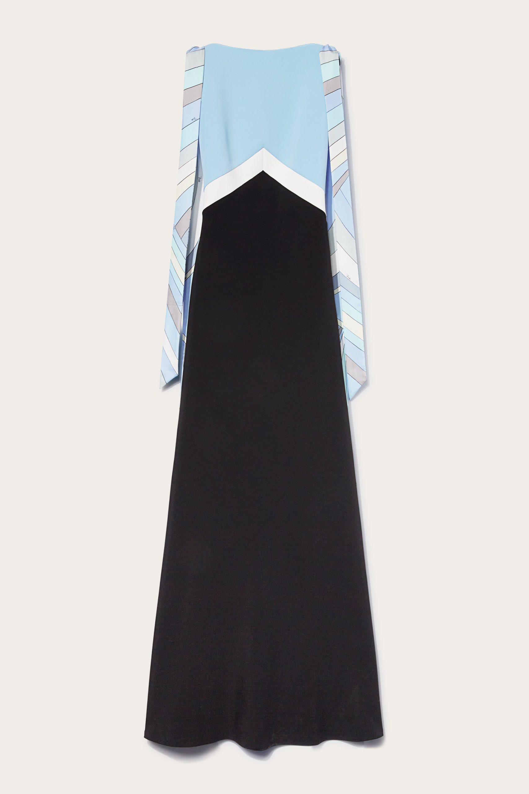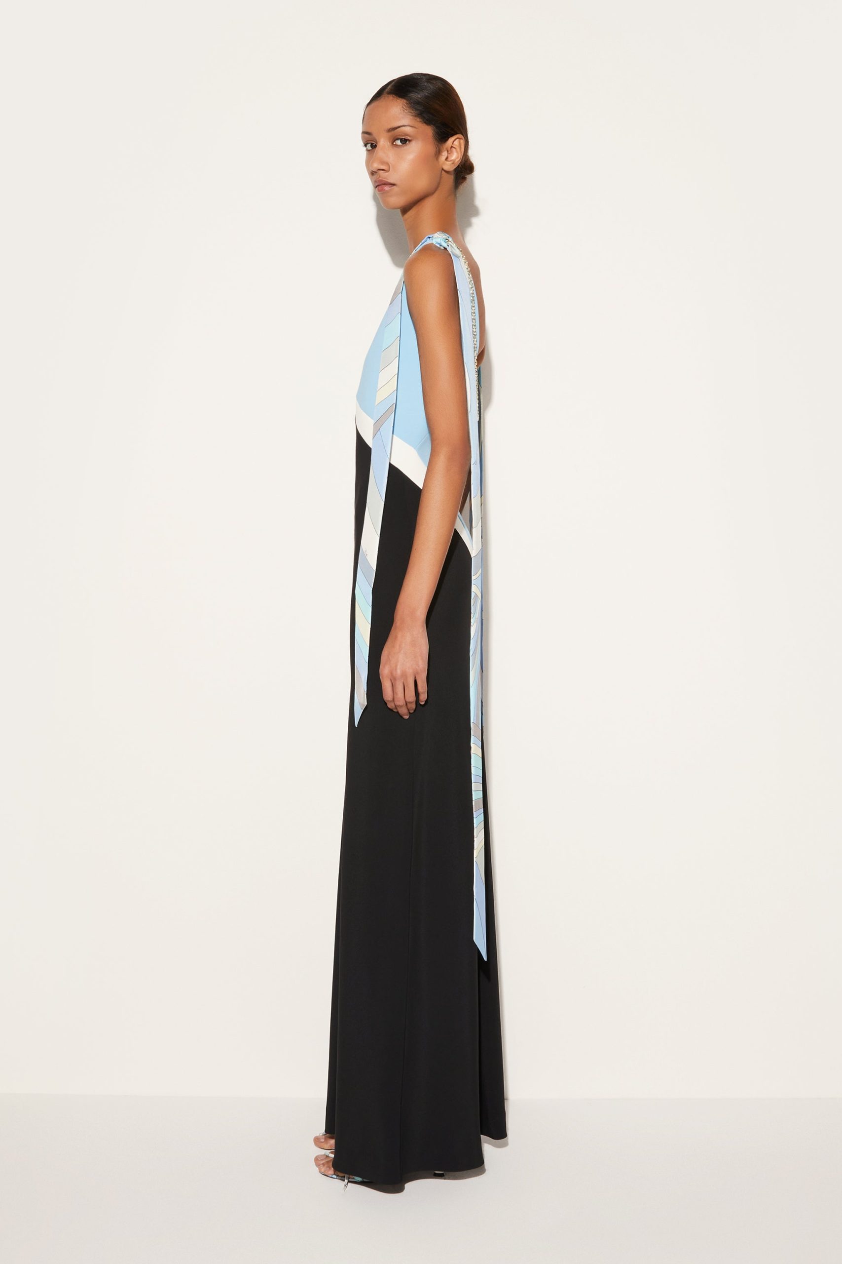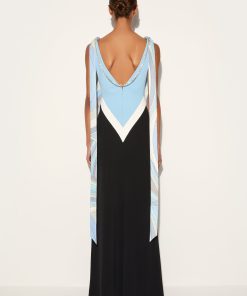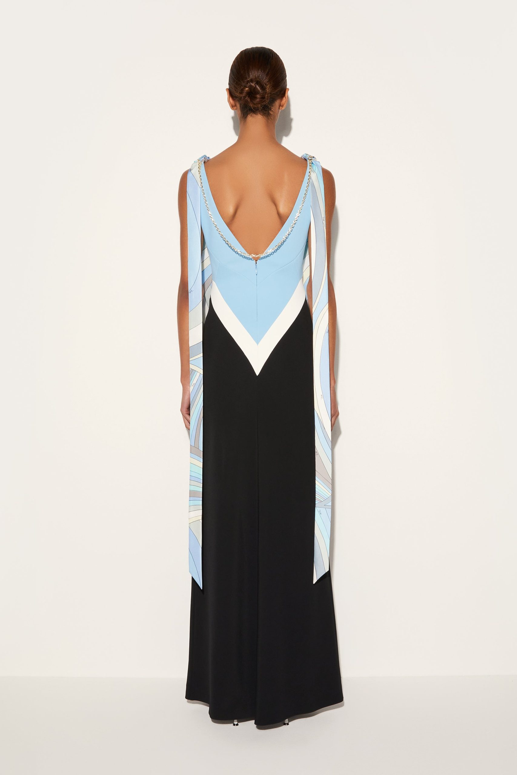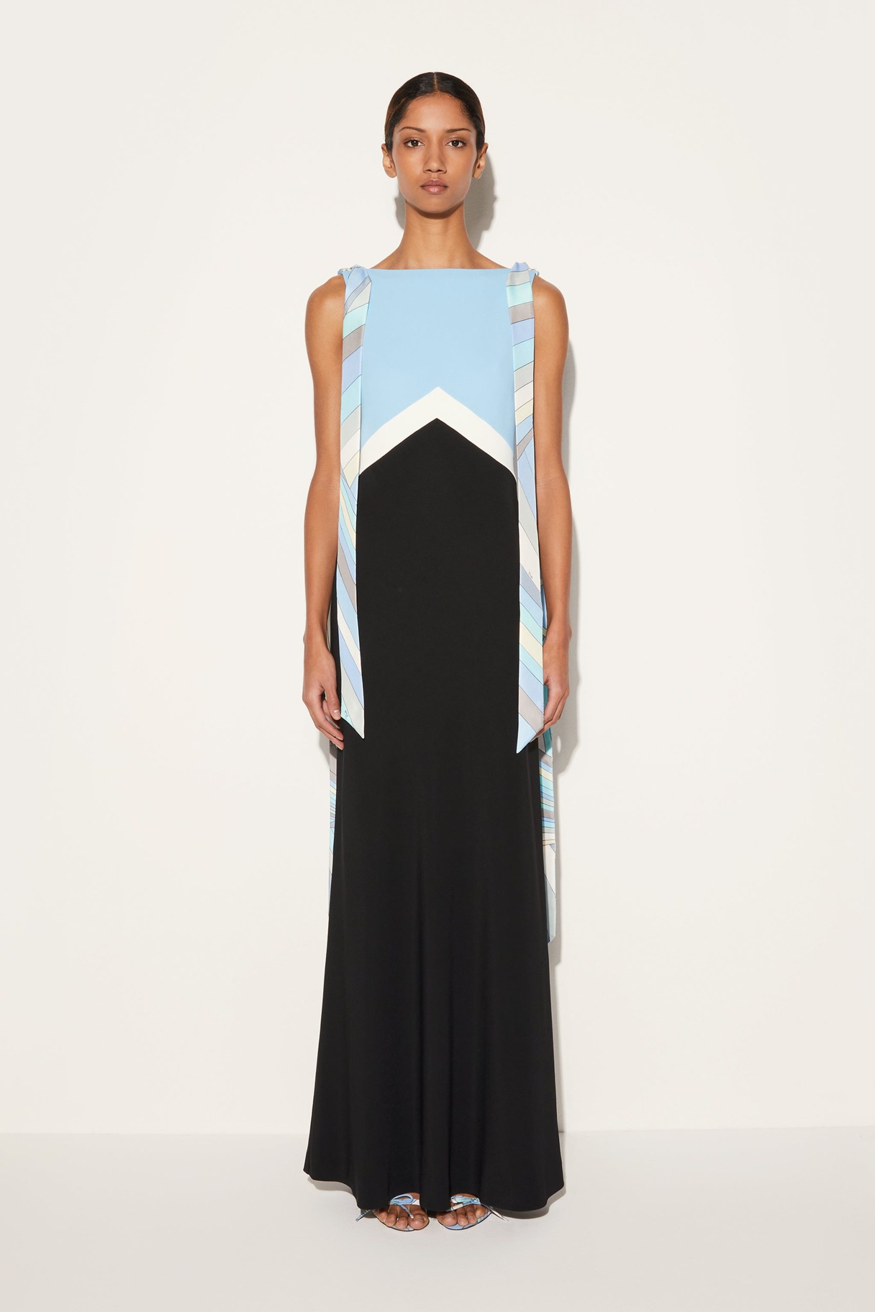 Inspired by ancient Grecian silhouettes, this georgette dress features Iride-print trims that drape elegantly from the shoulders. The chevron colourblocking and a silver-tone chain at the back add contemporary glamour.
