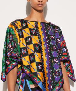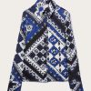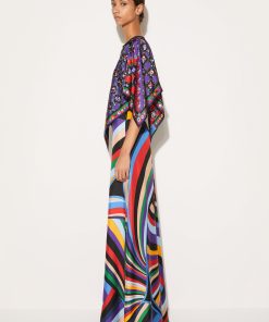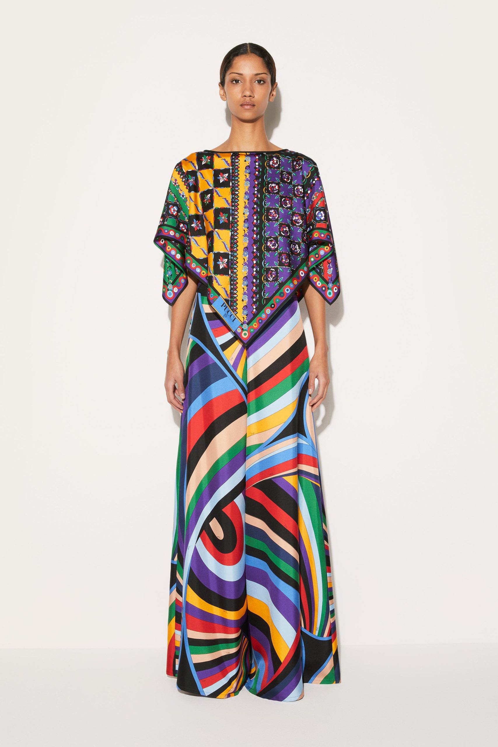 This kaftan top’s design calls to mind Pucci’s iconic scarves. It’s awash with the vibrant Festa and Onde prints and is finished with the brand’s moniker and intertwining fish logo at one corner – a motif introduced by Camille Miceli.