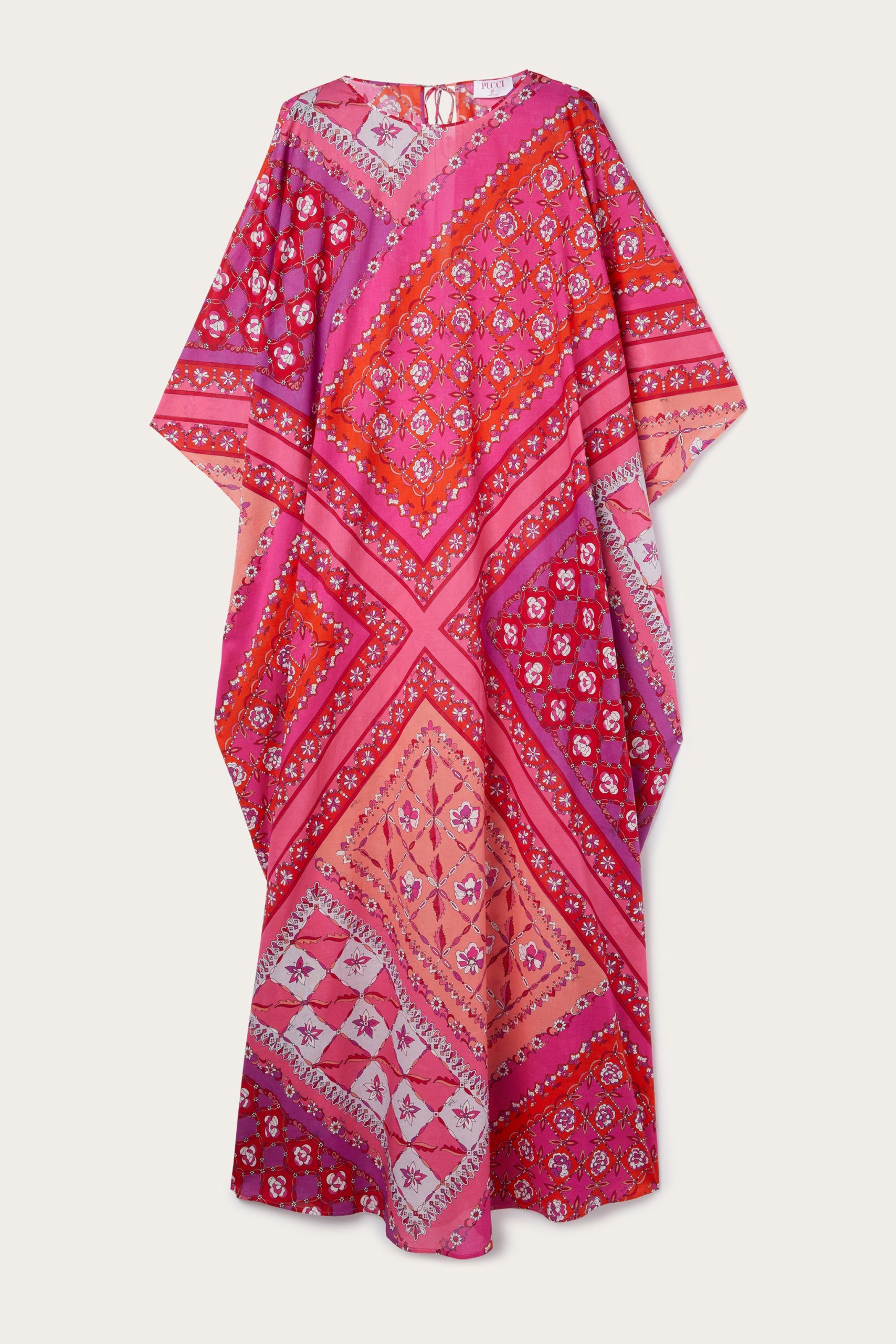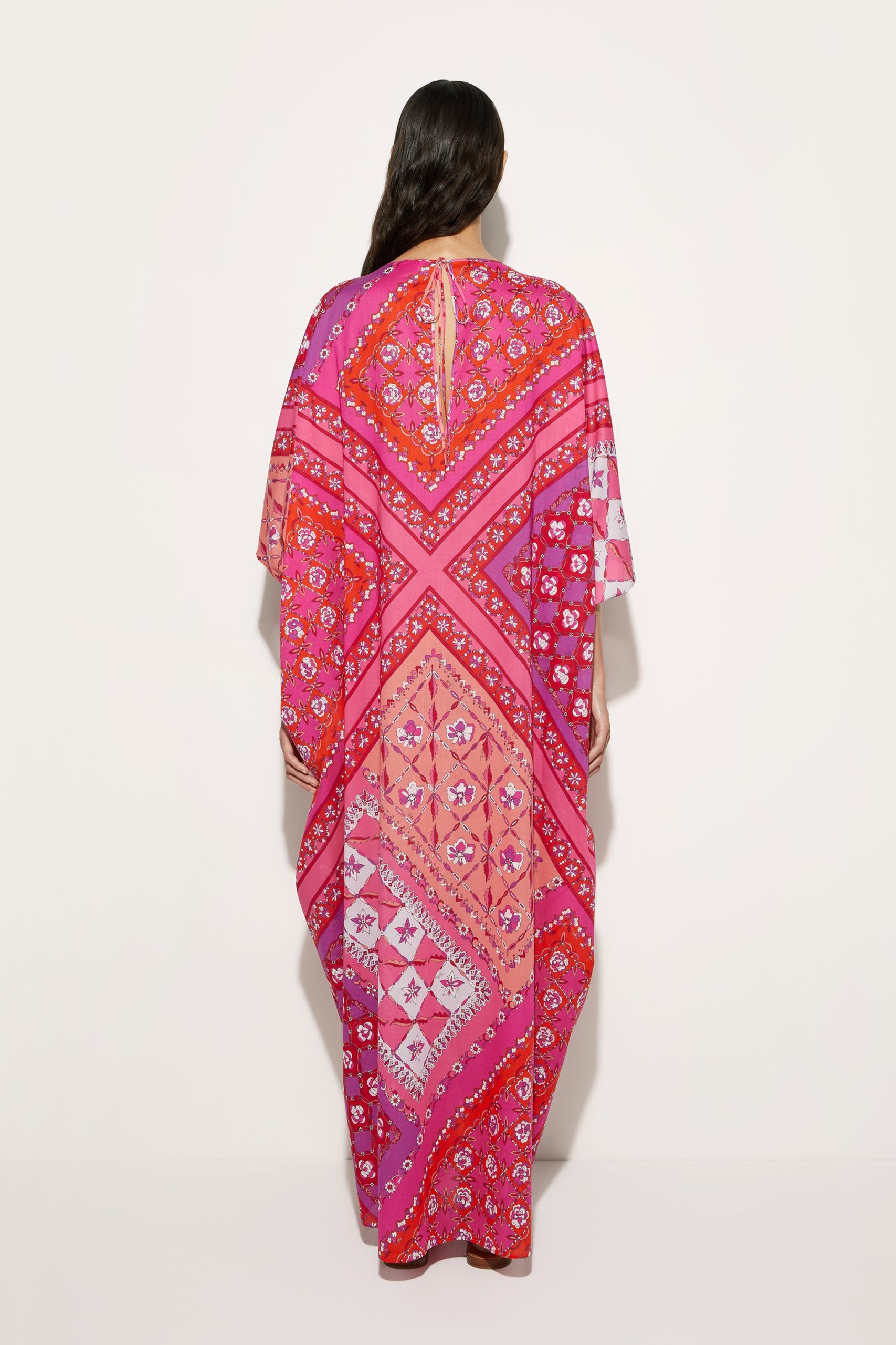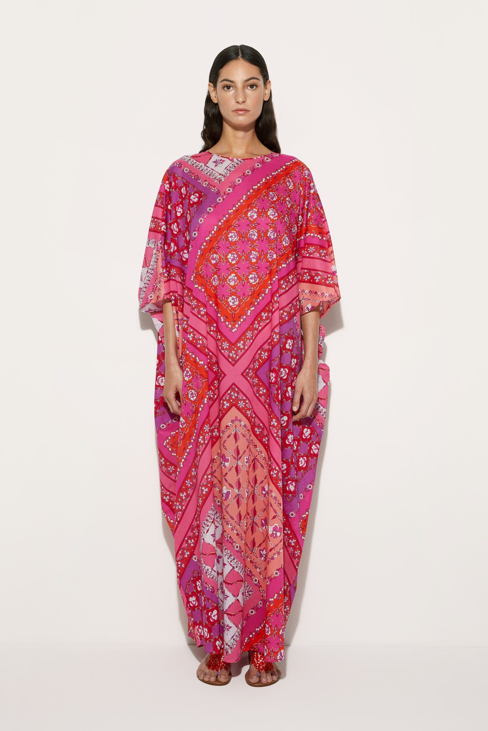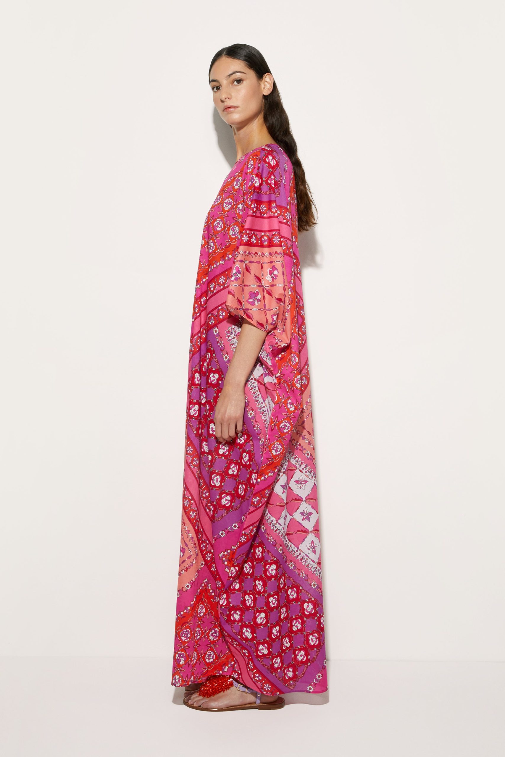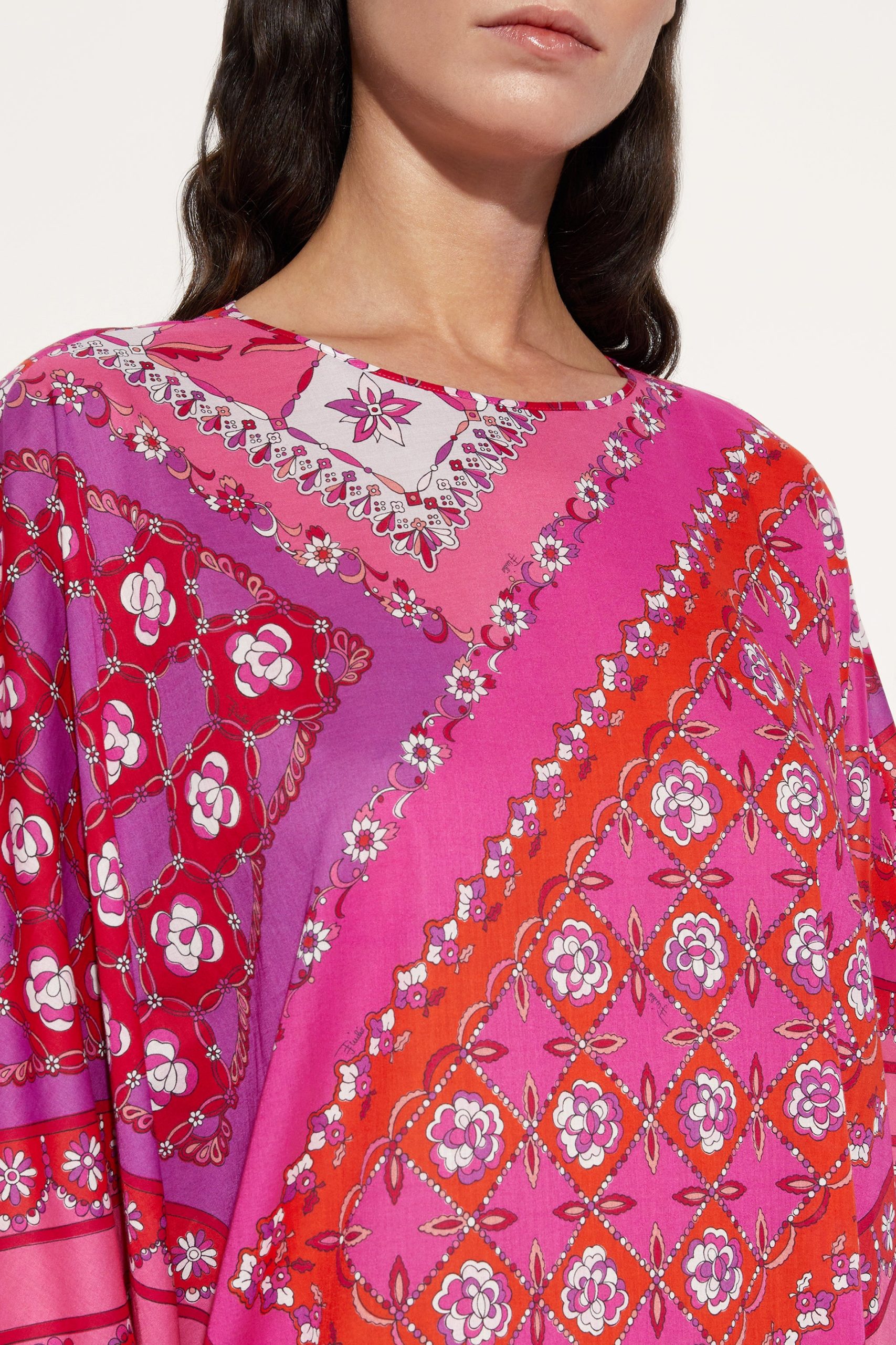 An icon of lightness and sophistication, this long caftan embodies the casual elegance typical of Pucci style. Its loose-fitting design naturally envelops the body, offering comfort and freedom of movement. Made of 100% cotton, it is perfect for warmer days, thanks to its cool and airy texture. The coral and fuchsia Festa print gives a vibrant and sophisticated touch, celebrating the brand’s energy and color dynamism.