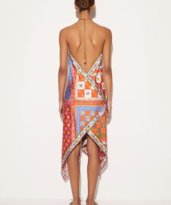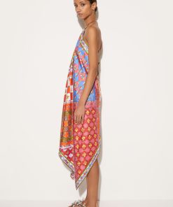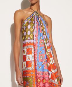 The dress is adorned with a modern iteration of the Festa print, paying homage to Pucci’s iconic pattern play. It’s cut from silk twill to a relaxed silhouette that falls to a handkerchief hem reminiscent of the house’s iconic scarves. Note the interlocking fish charm at the chain-link fastening: a motif introduced by Camille Miceli.