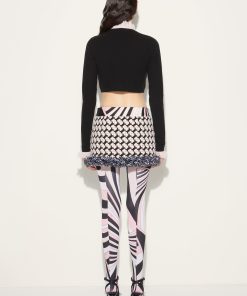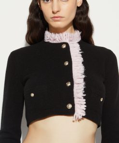 In a signature Pucci twist, pale pink fringing adds playful charm to this black cardigan. It’s crafted from virgin wool and cashmere to a slim silhouette and features gold-tone metal buttons engraved with the Marmo print.