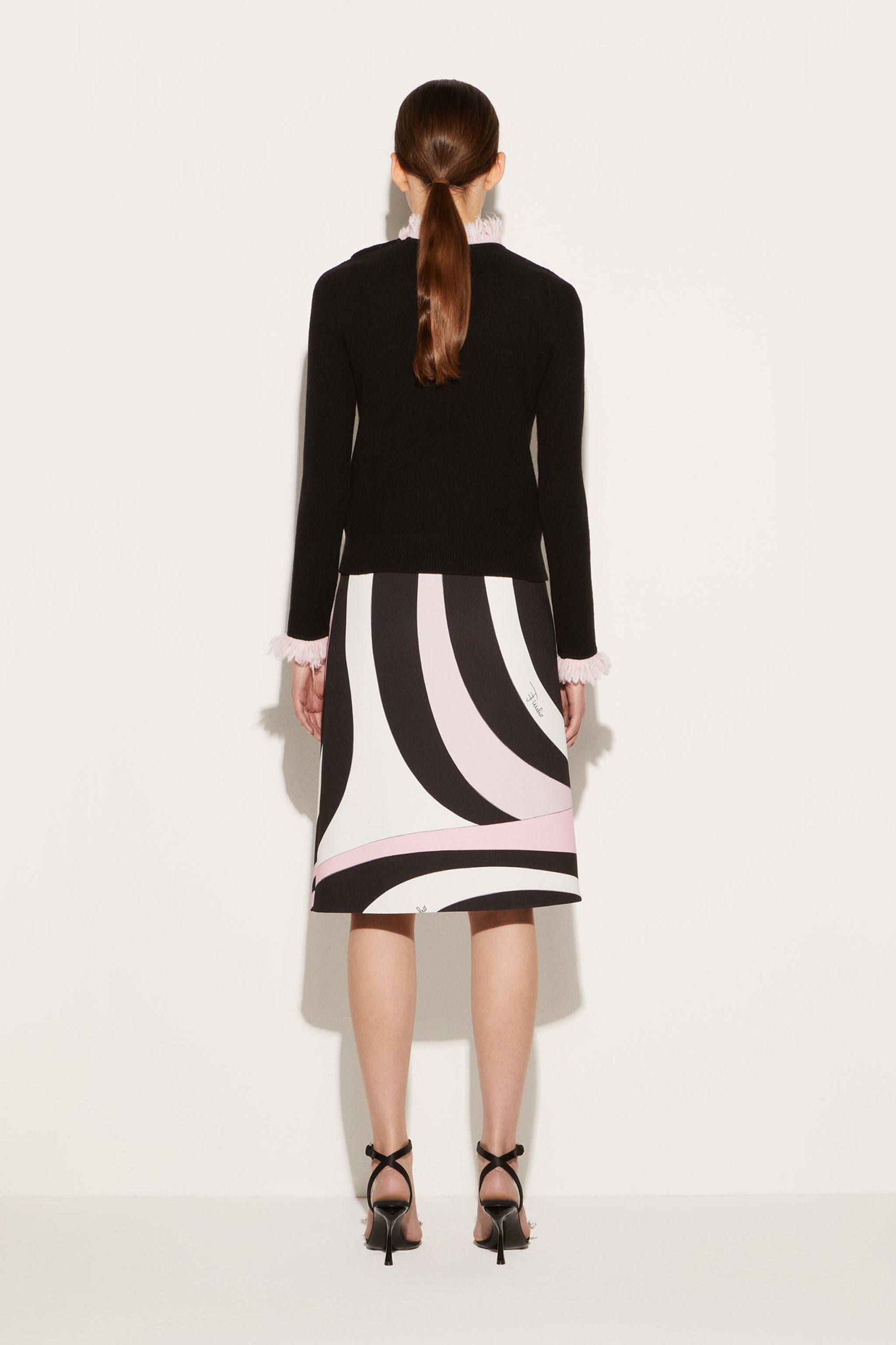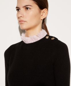 This sweater epitomises Pucci’s playful vision through the delicate pale pink fringing at the neckline and cuffs. It’s crafted from virgin wool and cashmere to a slim silhouette and finished with gold-tone metal buttons at one shoulder.