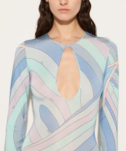 This bodysuit is adorned with a delicate pastel rendition of Pucci’s archival Iride print. It’s crafted from jersey satin to a simple silhouette that’s elevated with a teardrop-shaped cut-out at the front.