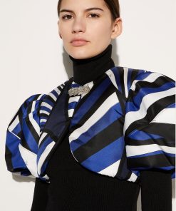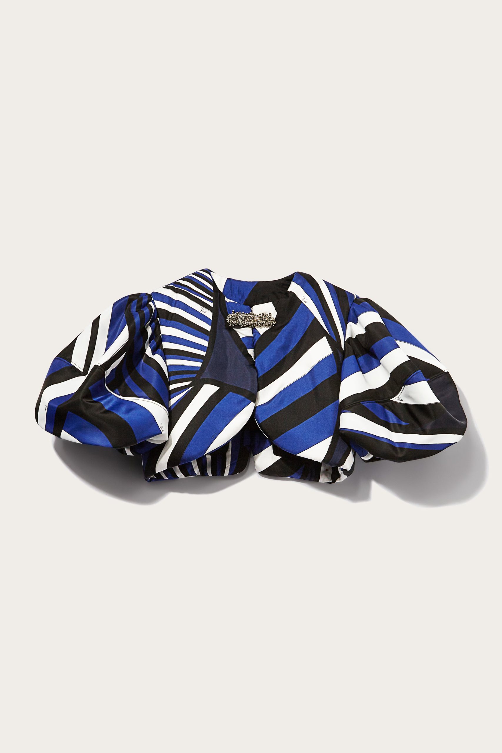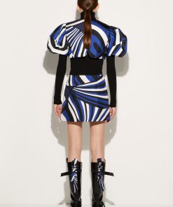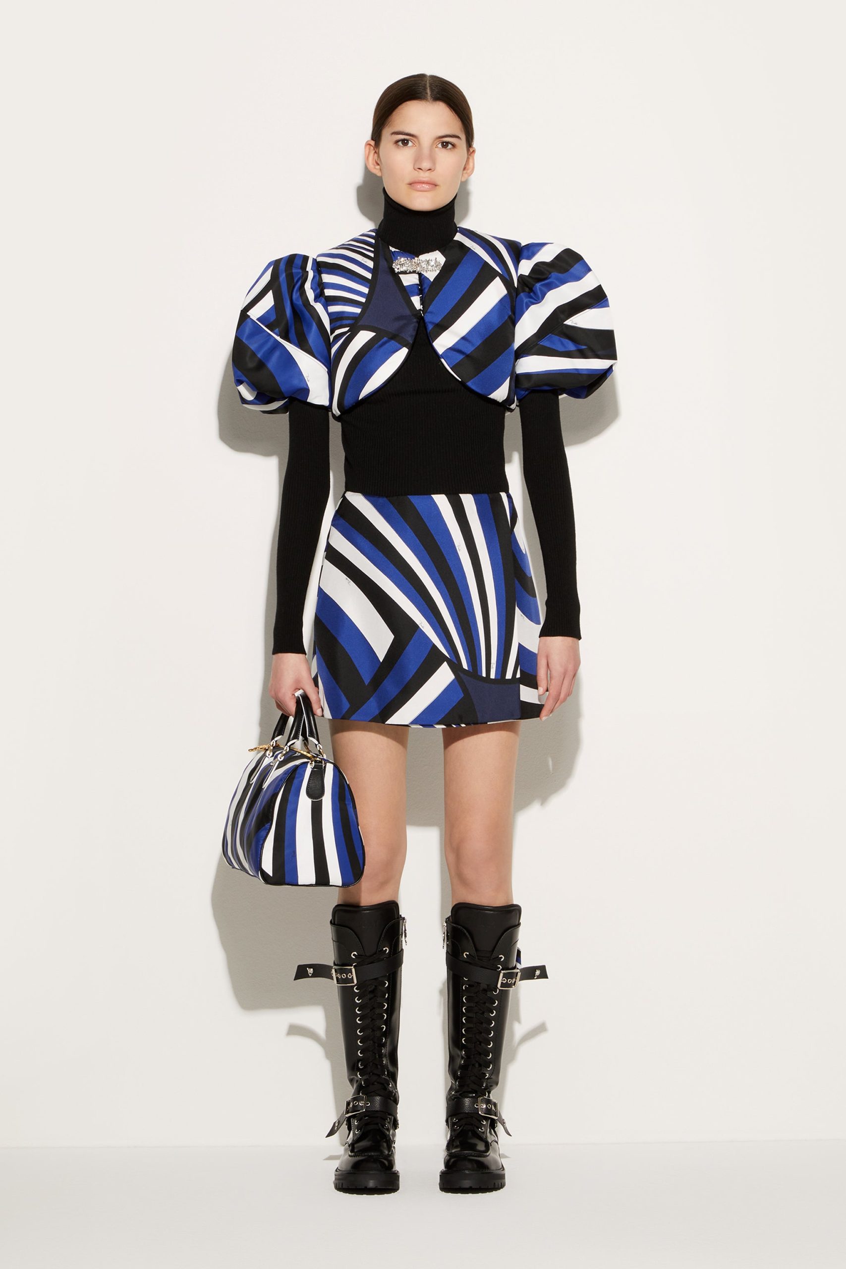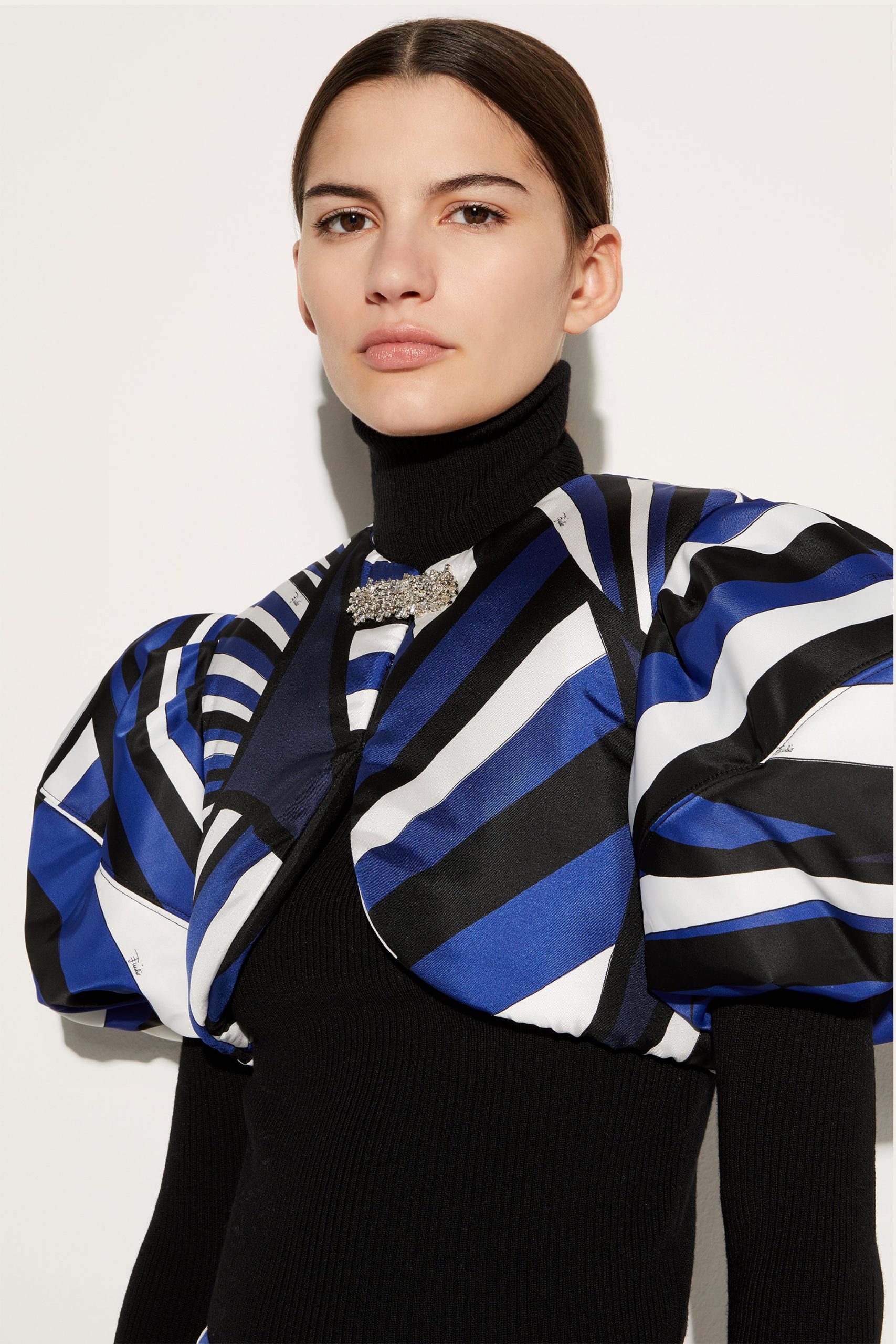 This jacket encapsulates Pucci’s high-octane impact, thanks to its cropped puff-sleeve silhouette and hypnotic Iride print. It’s cut from silk and is finished with a crystal-encrusted metal plaque at the neck.