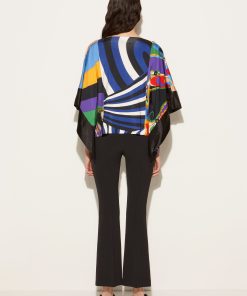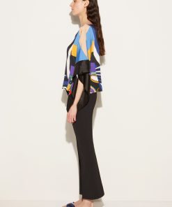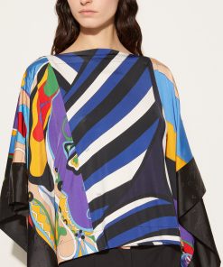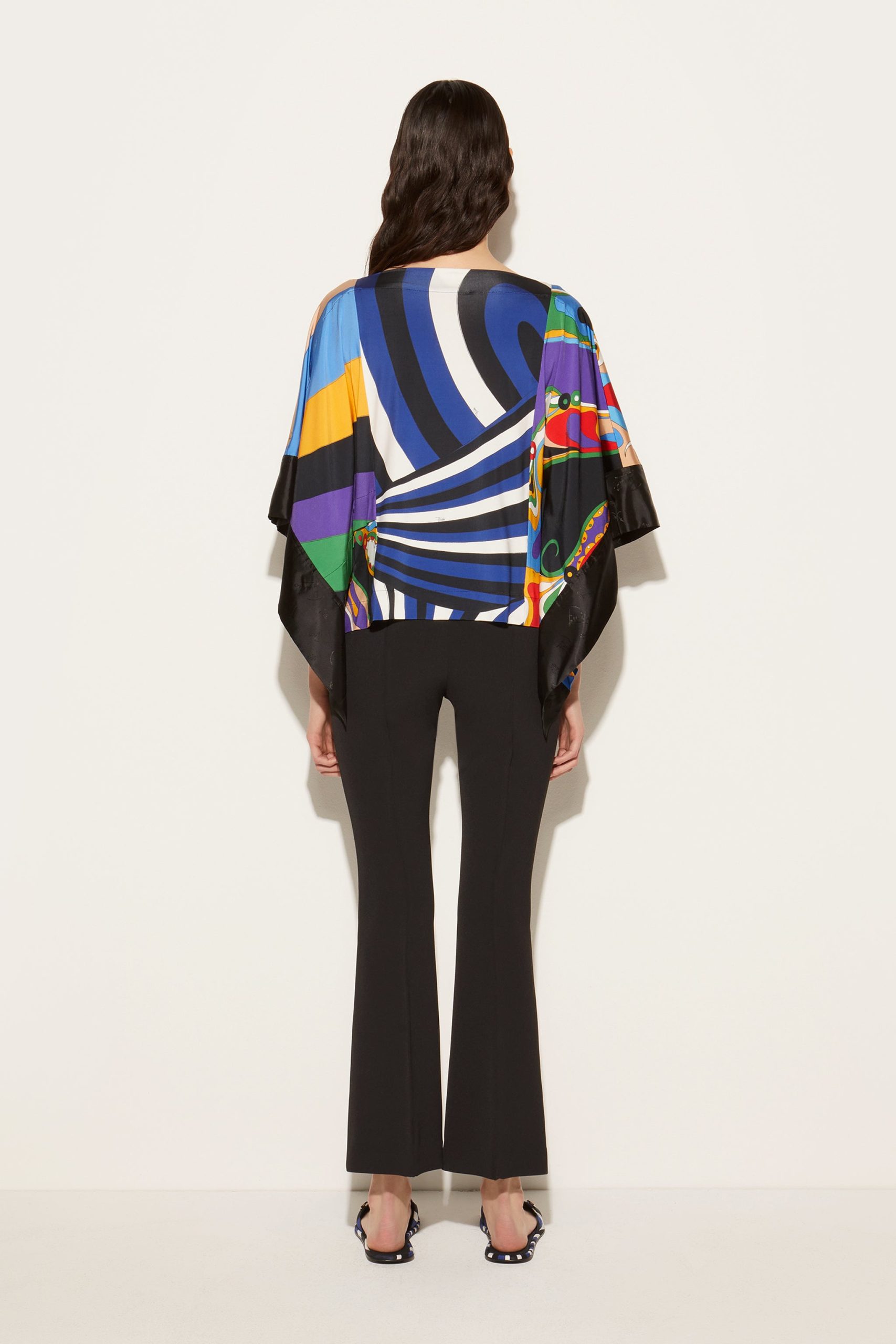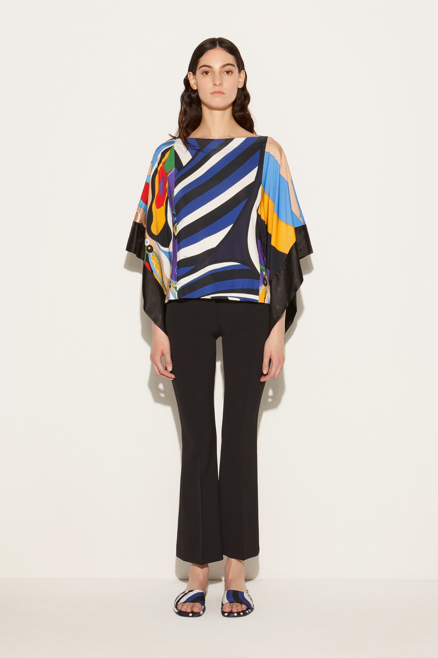 This kaftan top embodies Pucci’s celebration of fluid fabric and languid shapes, showcased through its gracefully draped sleeves. It’s cut with a signature boat neck and adorned with two Pucci prints: Iride and Orchidee.