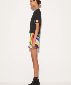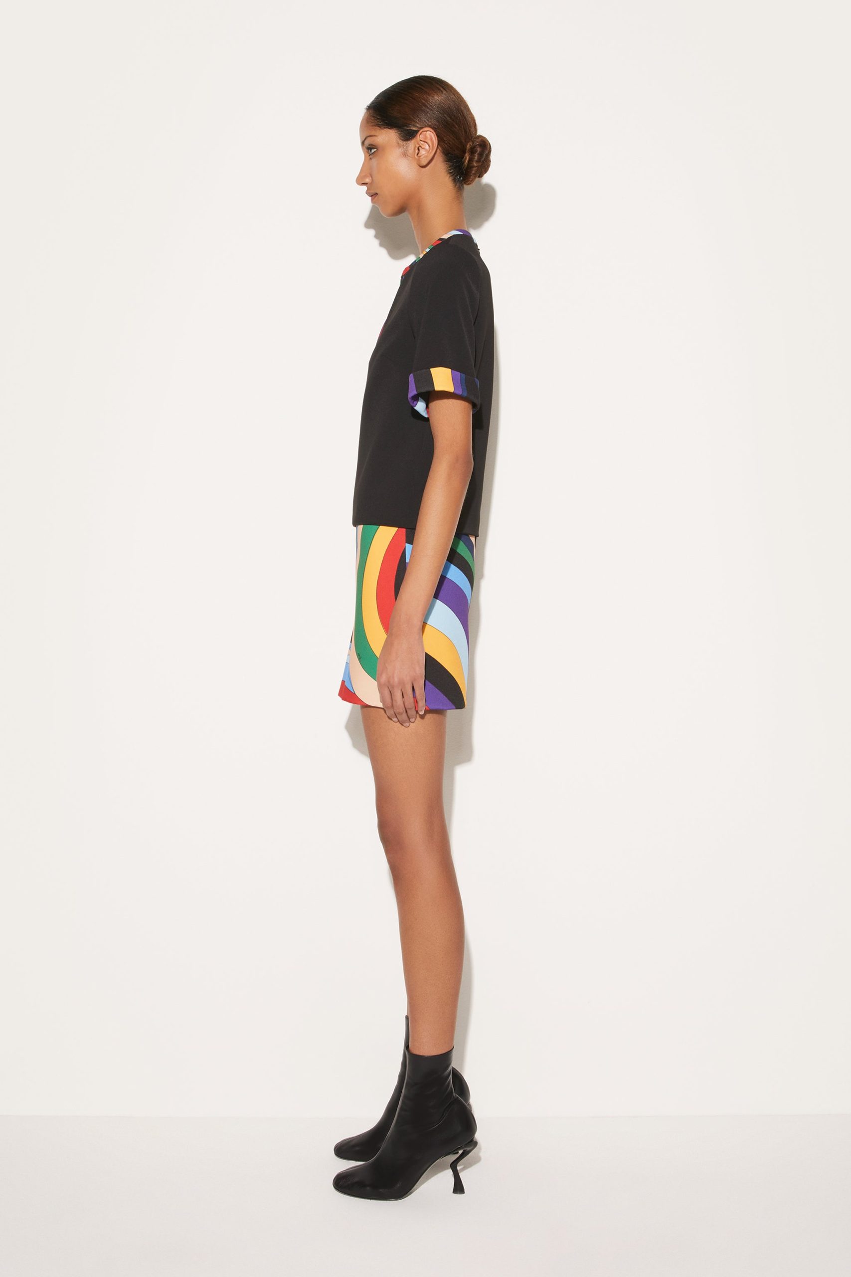 This black dress is enlivened with Pucci’s psychedelic Iride print in an array of bold hues. It’s cut from cady to a mini length and finished with a split neck.