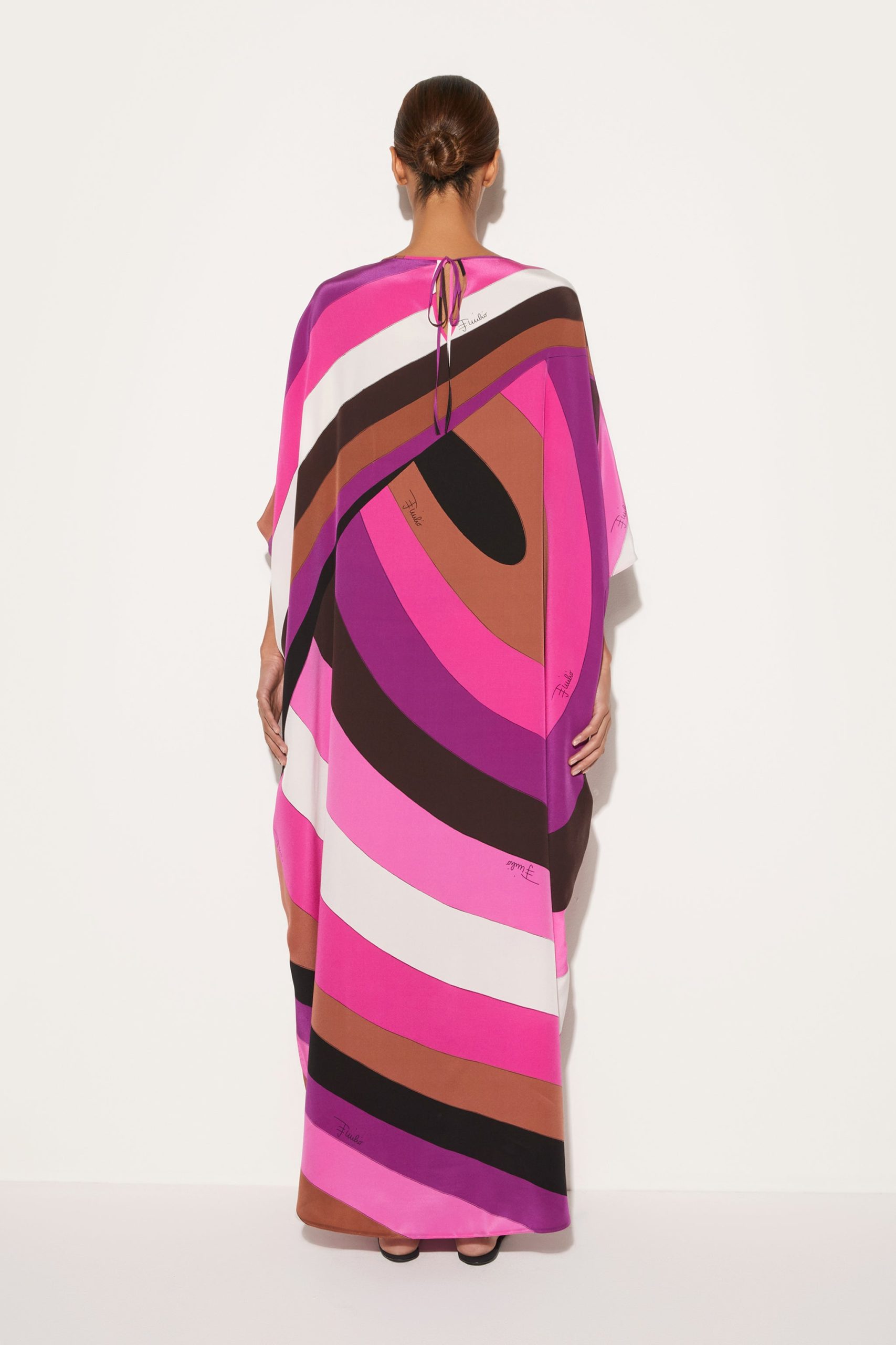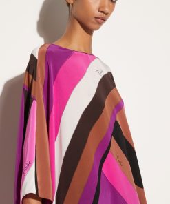 The Iride print covers this kaftan dress, rendered in shades of pink and purple. The silk crepe de chine construction and billowing silhouette recall Pucci’s original designs.