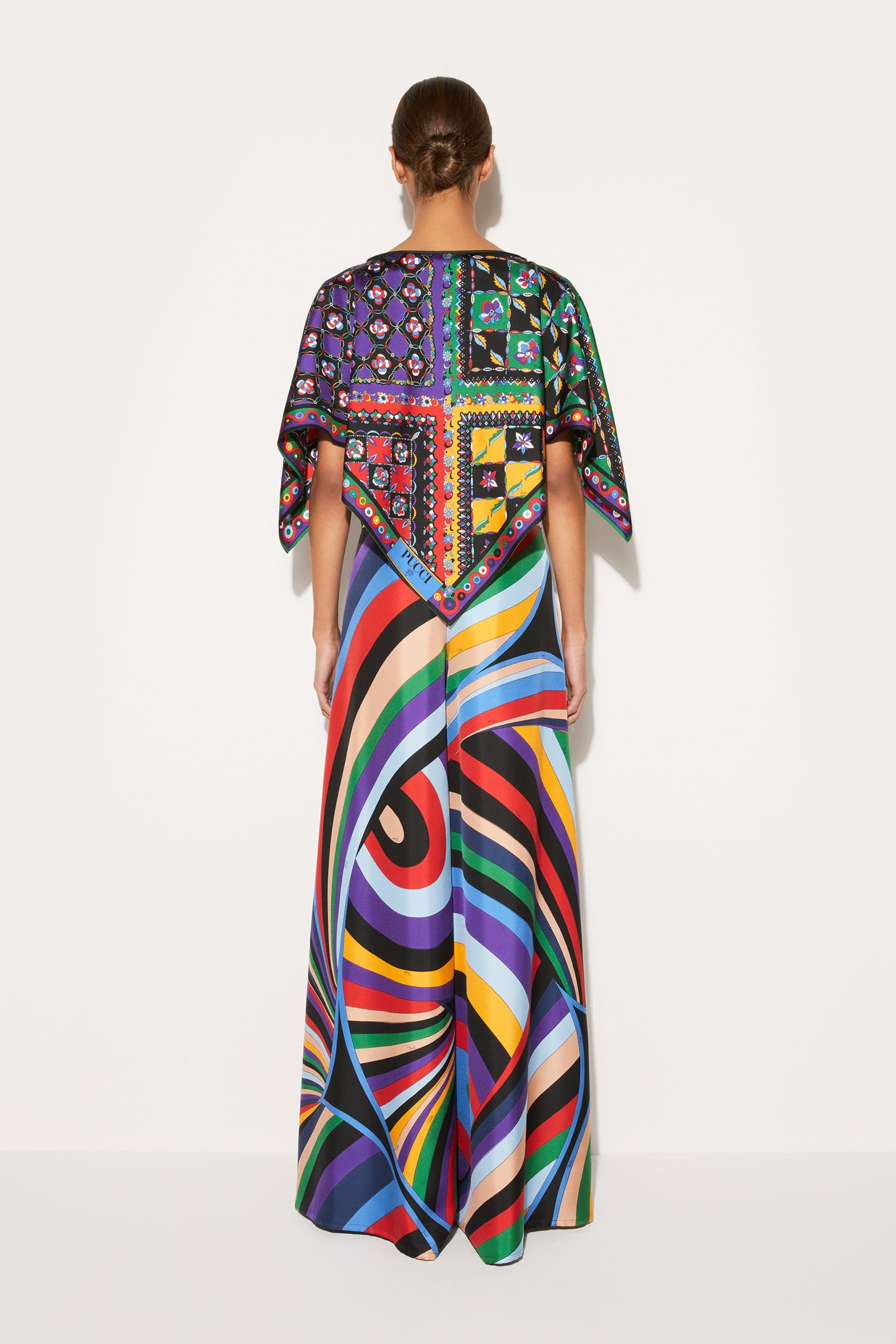 These trousers celebrate Pucci’s maximalist mood: they’re stamped with the Iride print in an array of bold colours. An impactful silhouette, they’re cut from silk twill to an exaggerated wide leg that falls to a sweeping floor length.