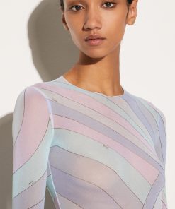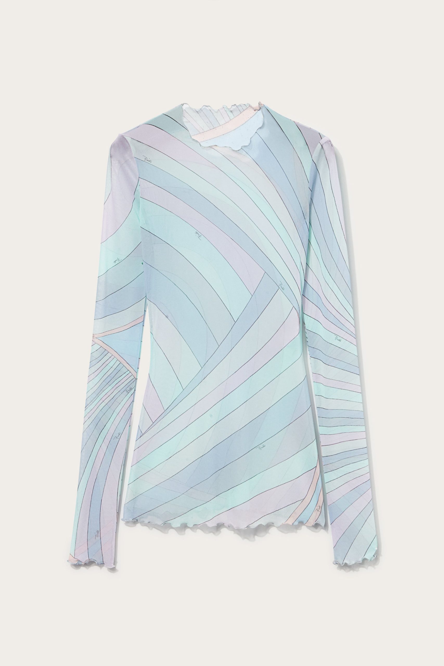 This top is decorated with a delicate pastel rendition of Pucci’s archival Iride print. Whimsical lettuce trims accentuate its ethereal charm.