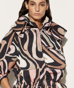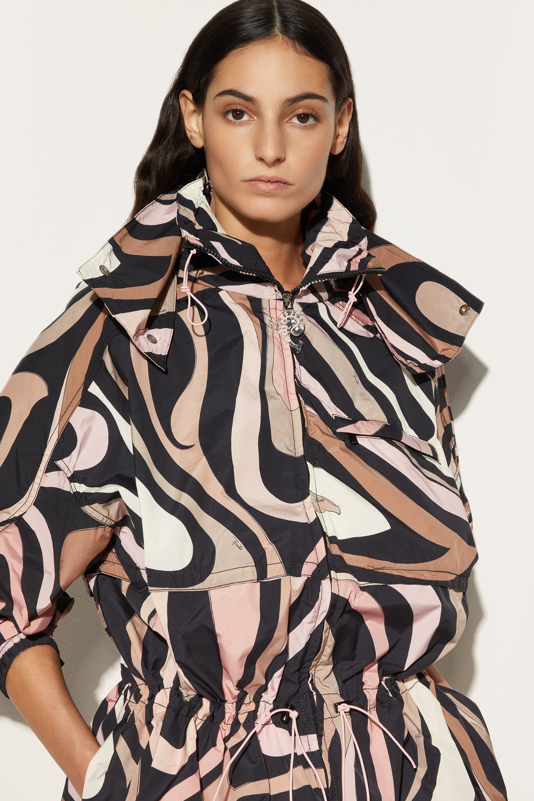 A jacket that redefines contemporary elegance with a charming and functional details. The fitted waist creates a feminine and sophisticated silhouette, while the high collar adds a touch of comfort and warmth, making it ideal for cooler days.Enhanced by the iconic black/nude Marmo print, which lends a touch of timeless sophistication, it is perfect to accompany you on formal occasions or to add character to your everyday look, combining style and practicality with Pucci’s unmistakable originality.