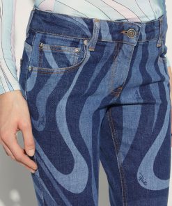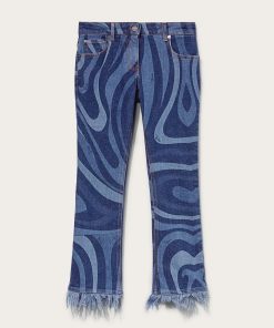 Camille Miceli revives the Marmo print from the archives to enliven these jeans. The pattern’s swirls are presented in a dark and light-blue wash, accentuating the slim silhouette and kick-flare hem.