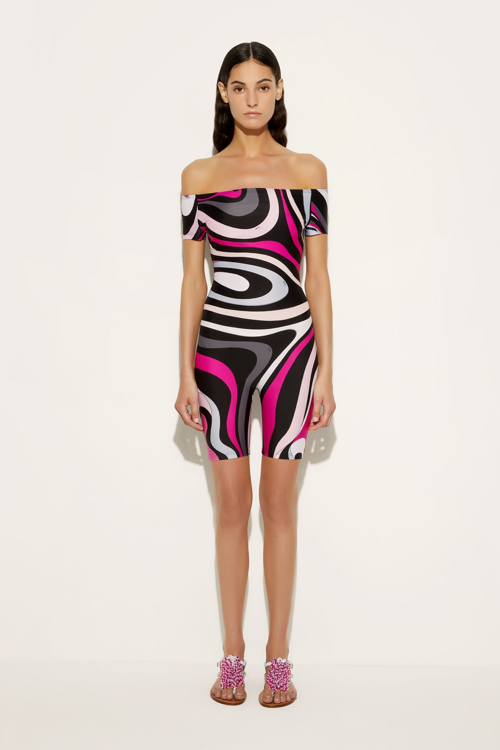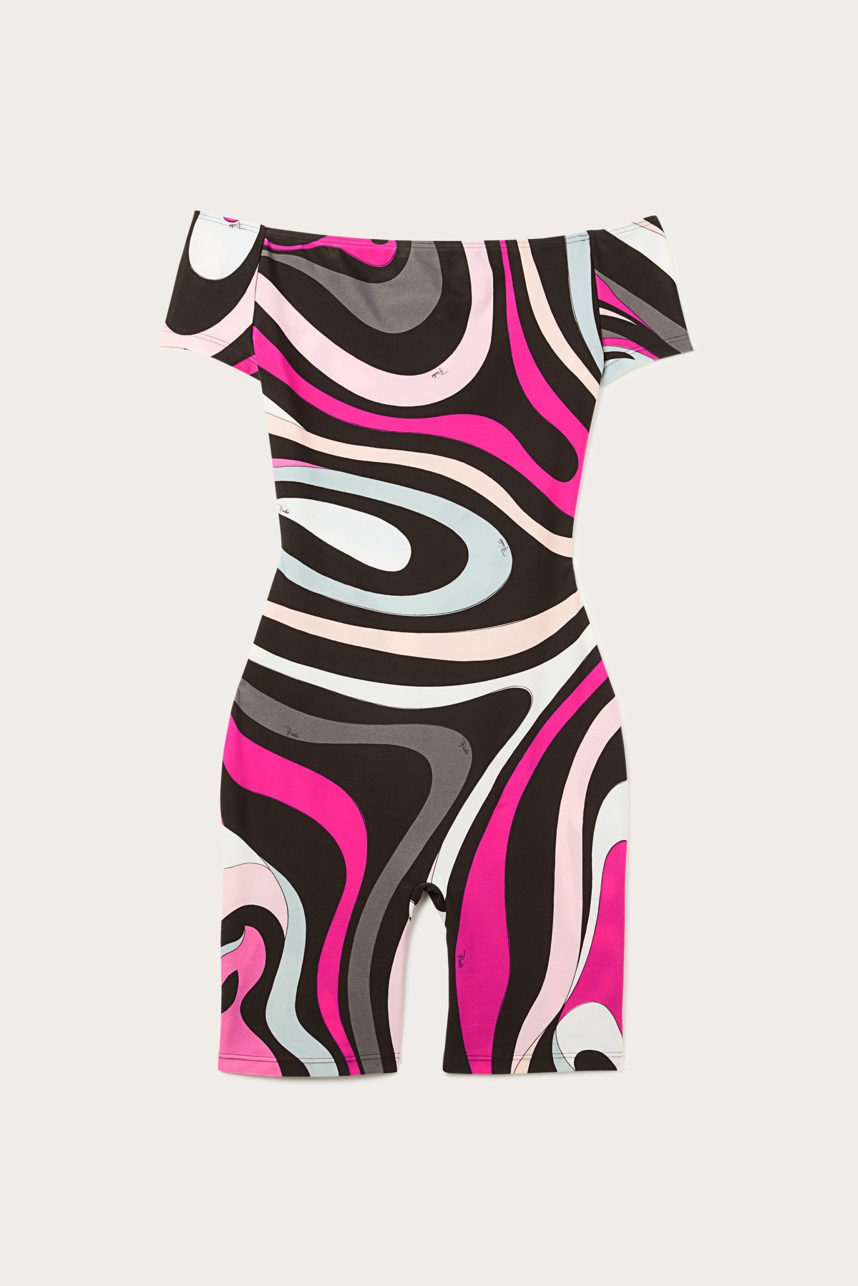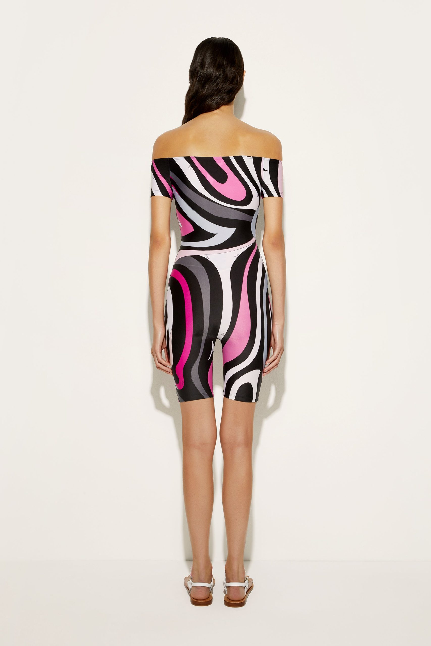 A bold and dynamic garment that celebrates tradition and innovation, this jumpsuit with cycling shorts and short sleeves is ideal for outdoor activities thanks to the stretch Lycra fabric with anti-UV treatment, and is perfect for both intense workouts and the most original urban looks.Camille Miceli reinterprets the delicate ripples of color of the iconic Marmo print with a hand-drawn aesthetic. A mix of visual poetry and practicality that makes this garment a unique piece to express personality and dynamism.