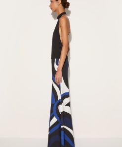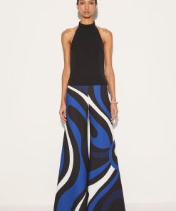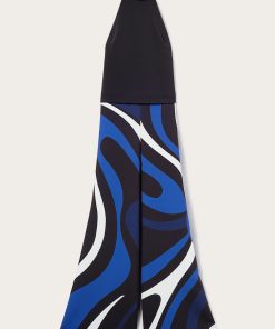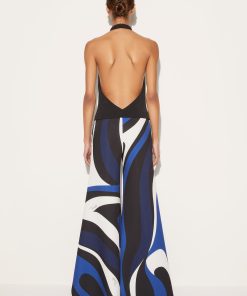 The Marmo print wraps the trousers of this wide-leg jumpsuit in swirling shades of blue. Comparatively simple, the cady silhouette falls from a padded halterneck top to retro-inspired palazzo-style bottoms.