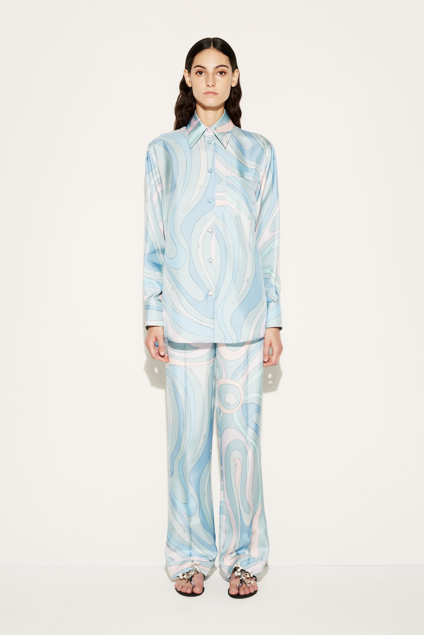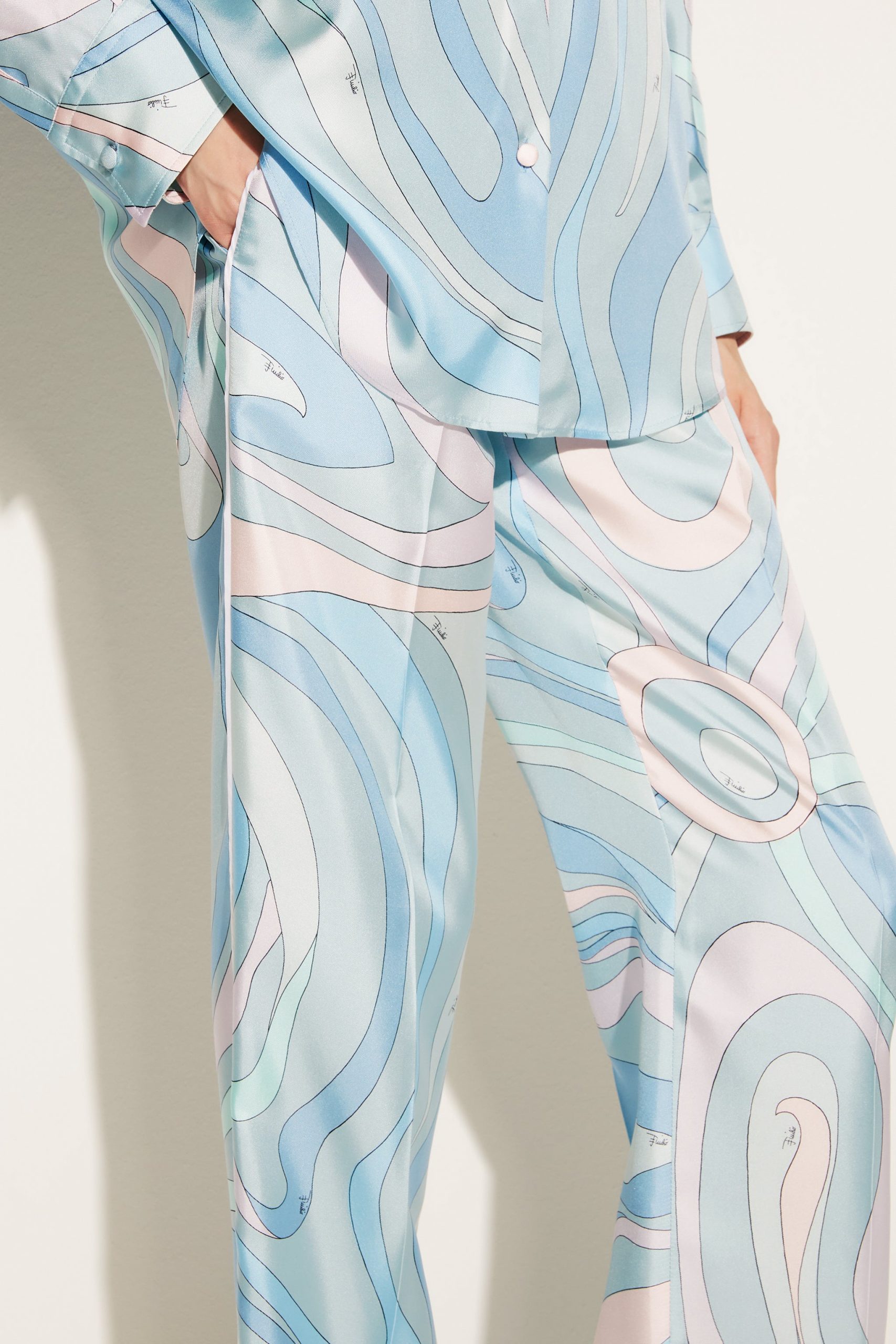 These trousers celebrate the archival Marmo print: the 60s motif is rendered in a delicate pastel palette. They’re cut from silk twill to a relaxed, pyjama-inspired silhouette with pressed creases and turn-up cuffs.