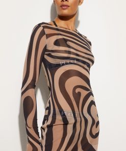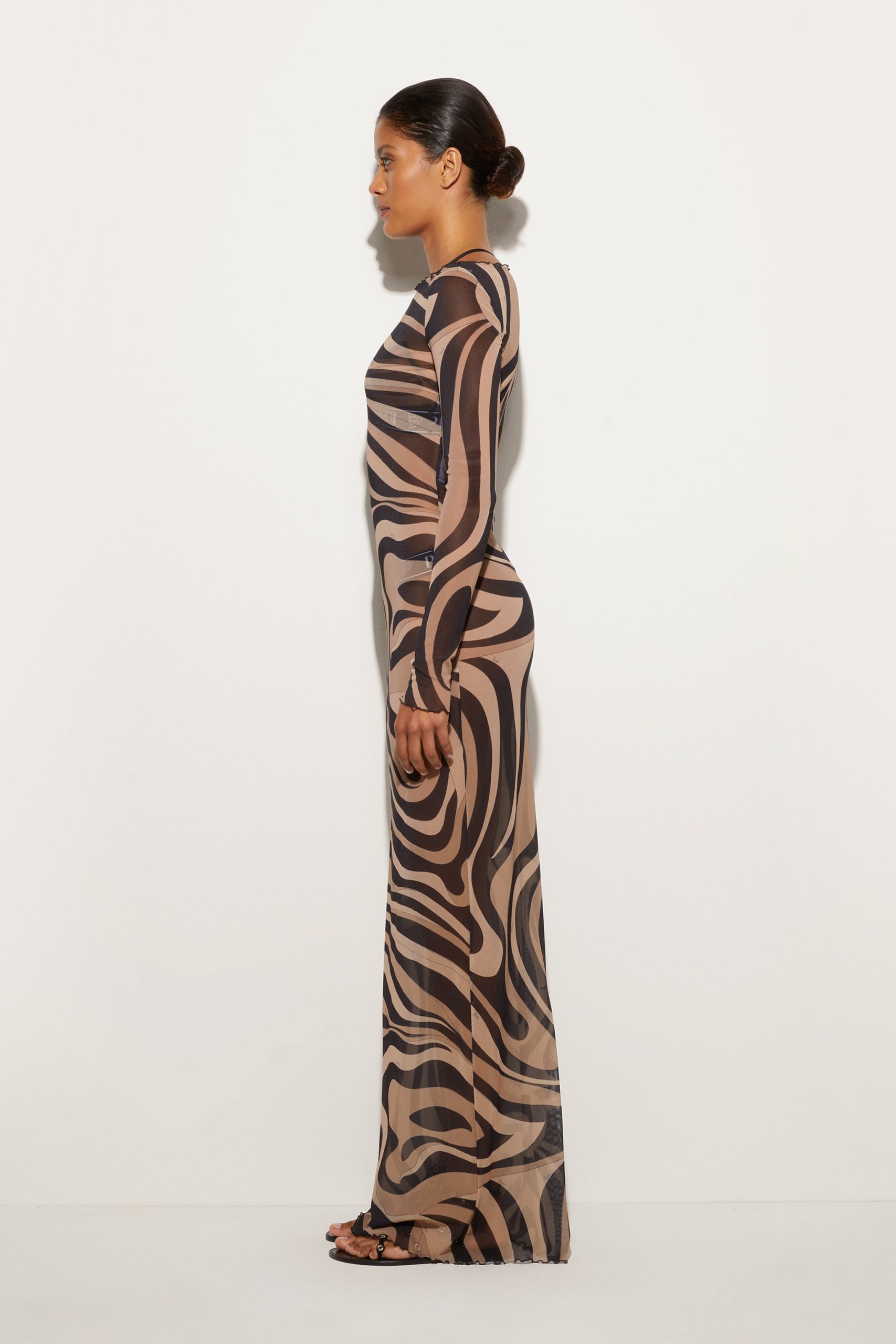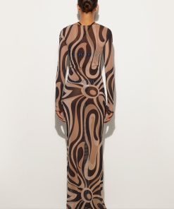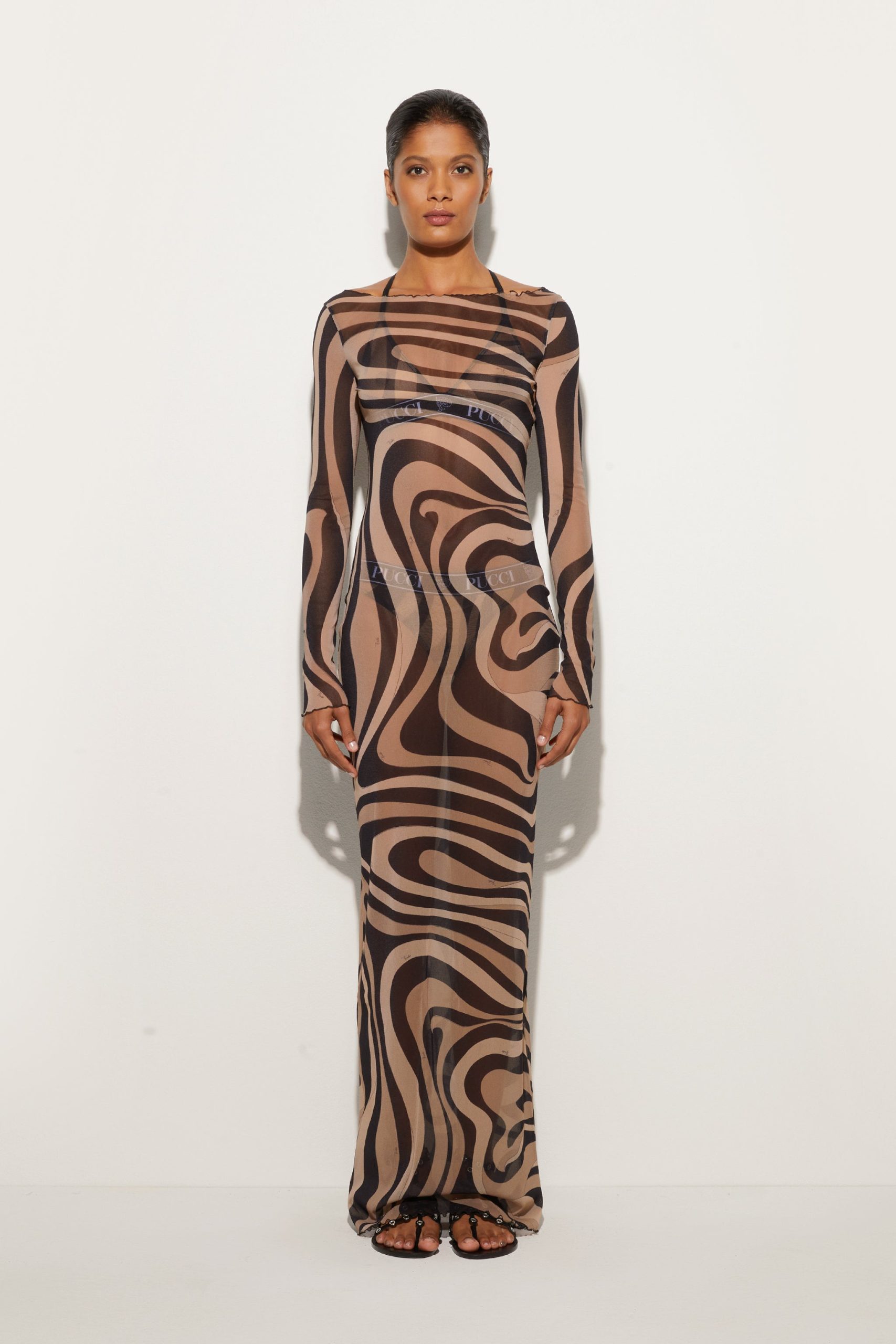 A wearable work of art, this stretch tulle long dress captures the essence of Pucci DNA with its iconic Marmo print in refined shades of black and beige. The transparency of the lightweight fabric, as soft as a second skin, makes it perfect for a surprising and colorful layering effect for a unique and bold look. Designed for those who love to play with style, it is the ideal garment for exclusive vacations or events by the sea.