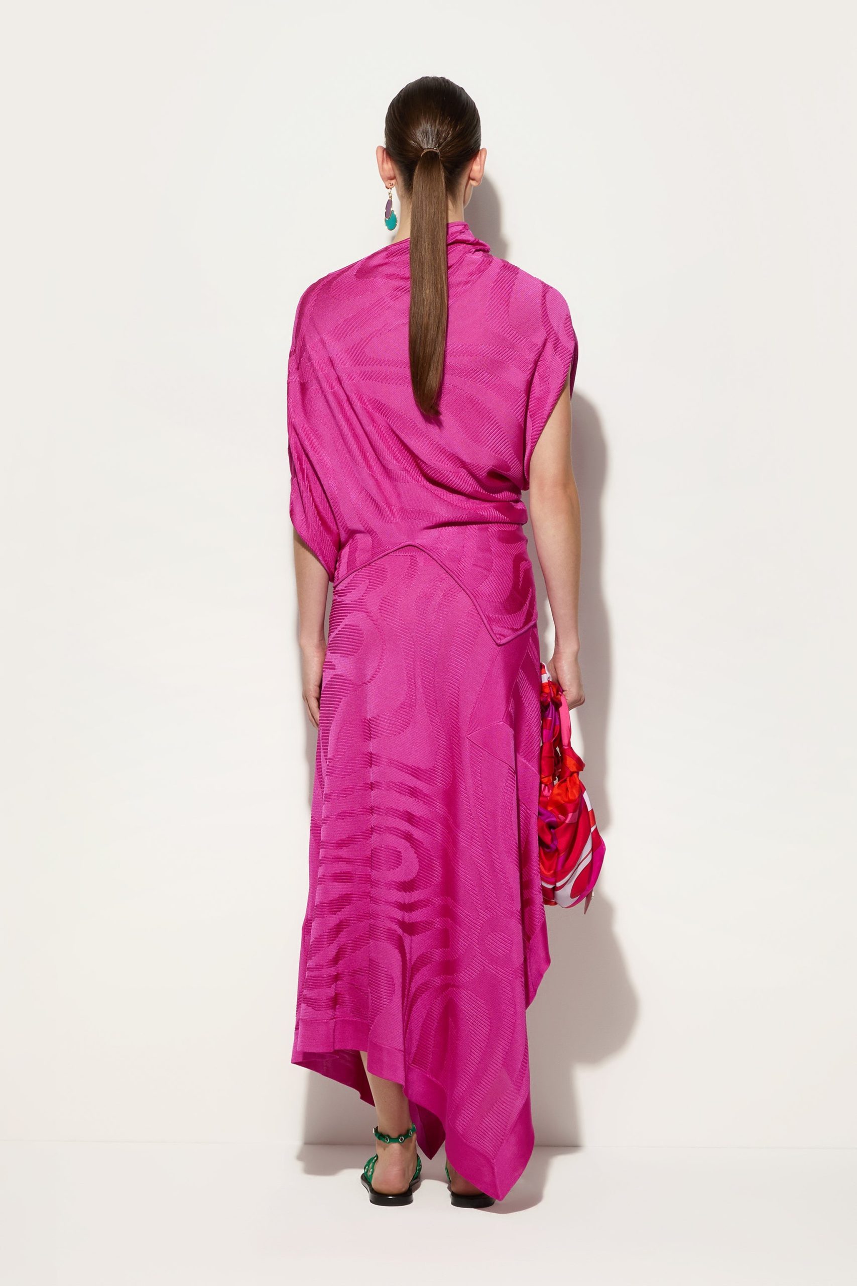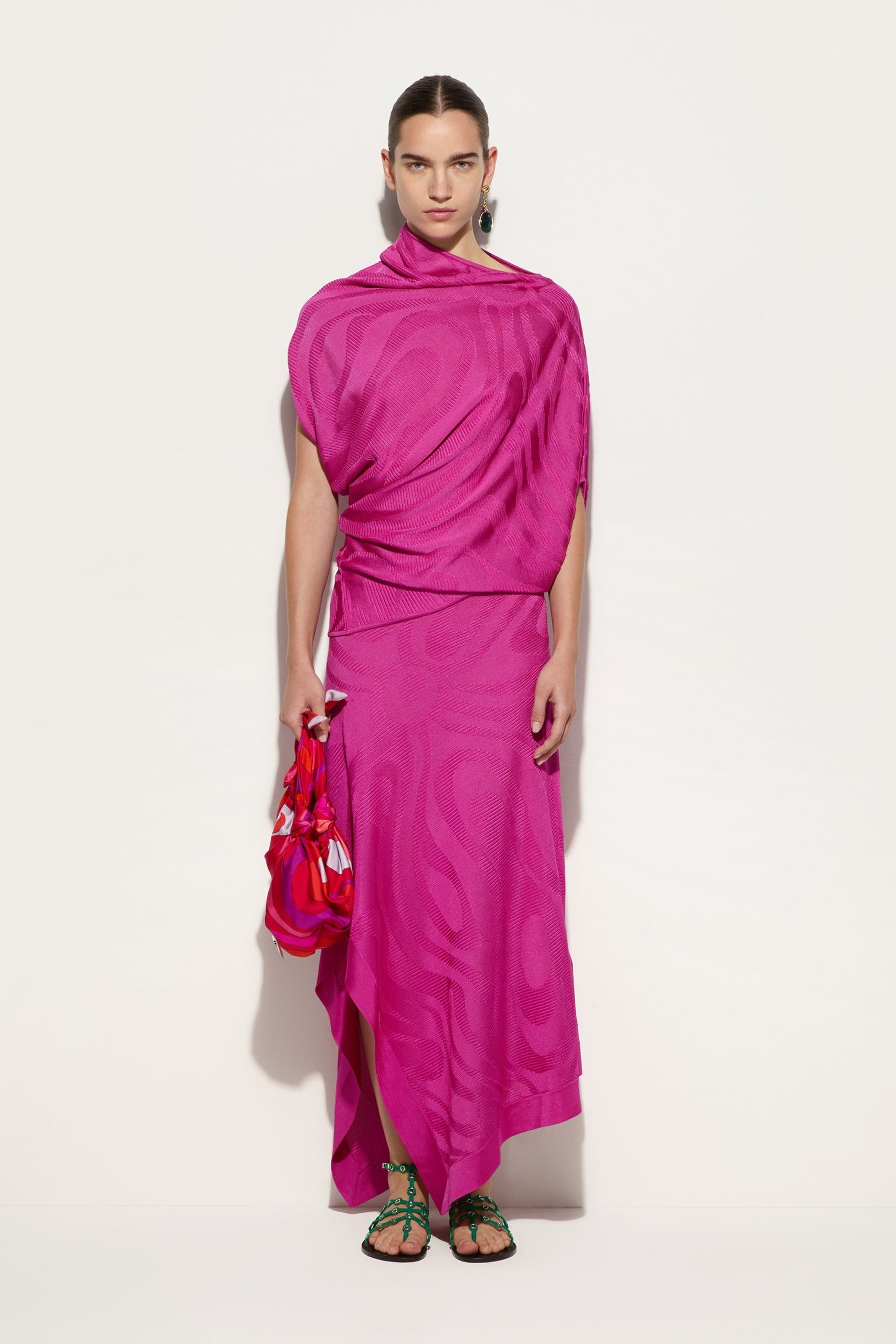 A garment that glides with elegance, perfect for any occasion when you want to feel sophisticated yet comfortable. This long, flowing skirt is a must-have for your wardrobe: the ribbed waistband ensures comfort and enhances the figure, while the Marmo texture, in a lovely Hibiscus Fané color, lends a unique touch.