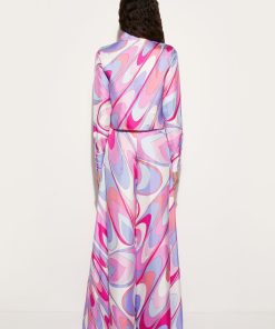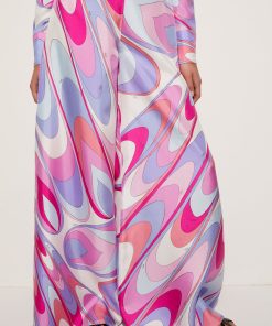 These trousers celebrate Pucci’s maximalist mood: they’re stamped with the Onde print in an array of vibrant colours. An impactful silhouette, they’re cut from silk twill to an exaggerated wide leg that falls to a sweeping floor length.
