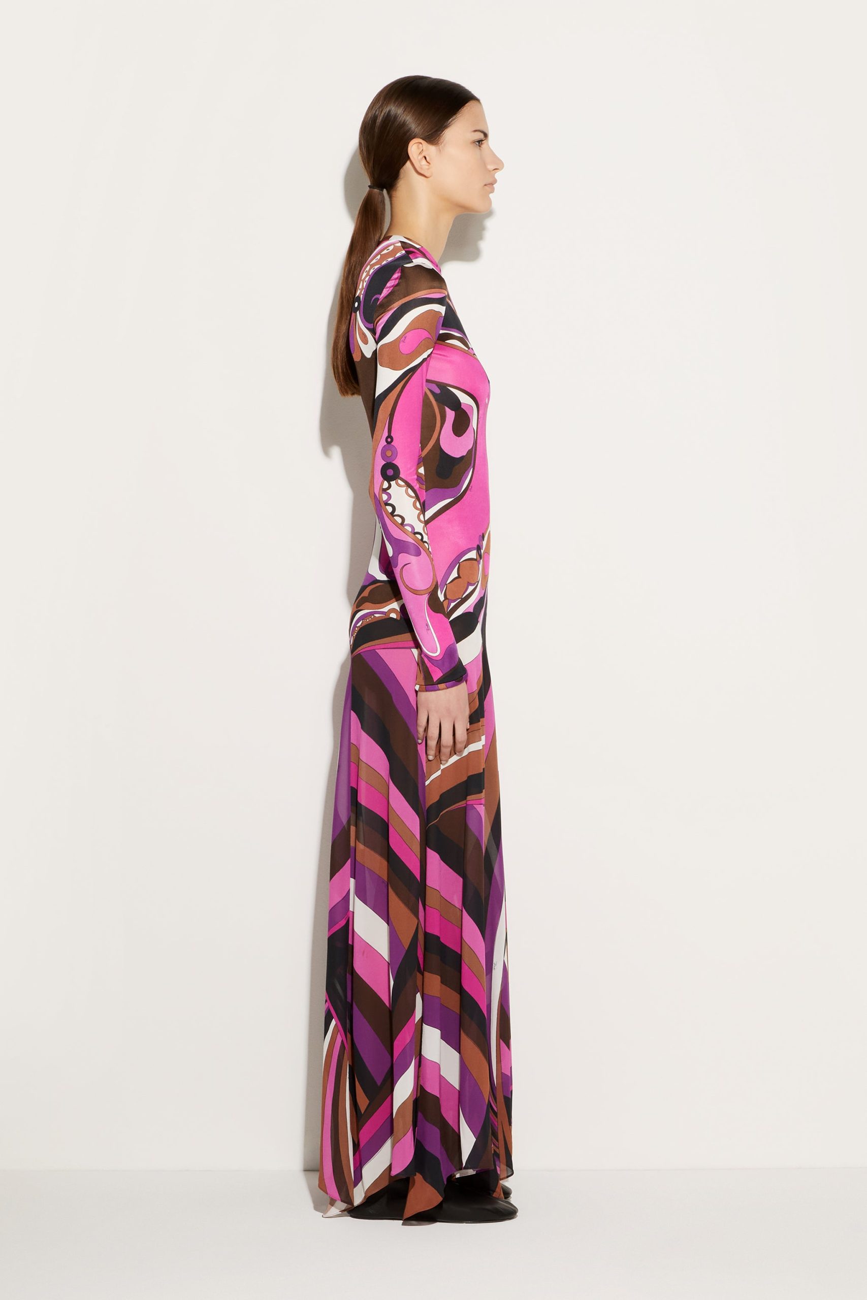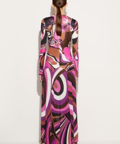 Adorned with two of Pucci’s most energetic prints, the Orchidee and the Iride, this dress is awash with vibrant pattern play. It’s cut from a sleek jersey satin that fits close to the body and falls to a long skirt with fluid movement.