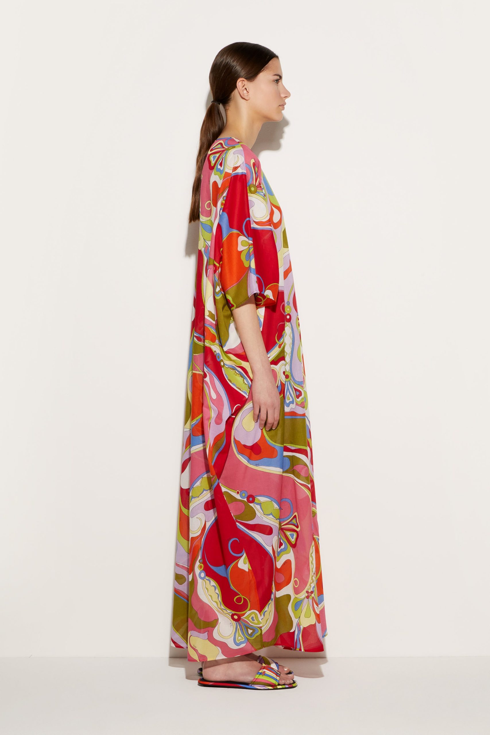 The archival Orchidee print covers this kaftan dress, rendered in bright shades of red, pink and green. The breezy cotton muslin design and billowing silhouette recall Pucci’s original designs.