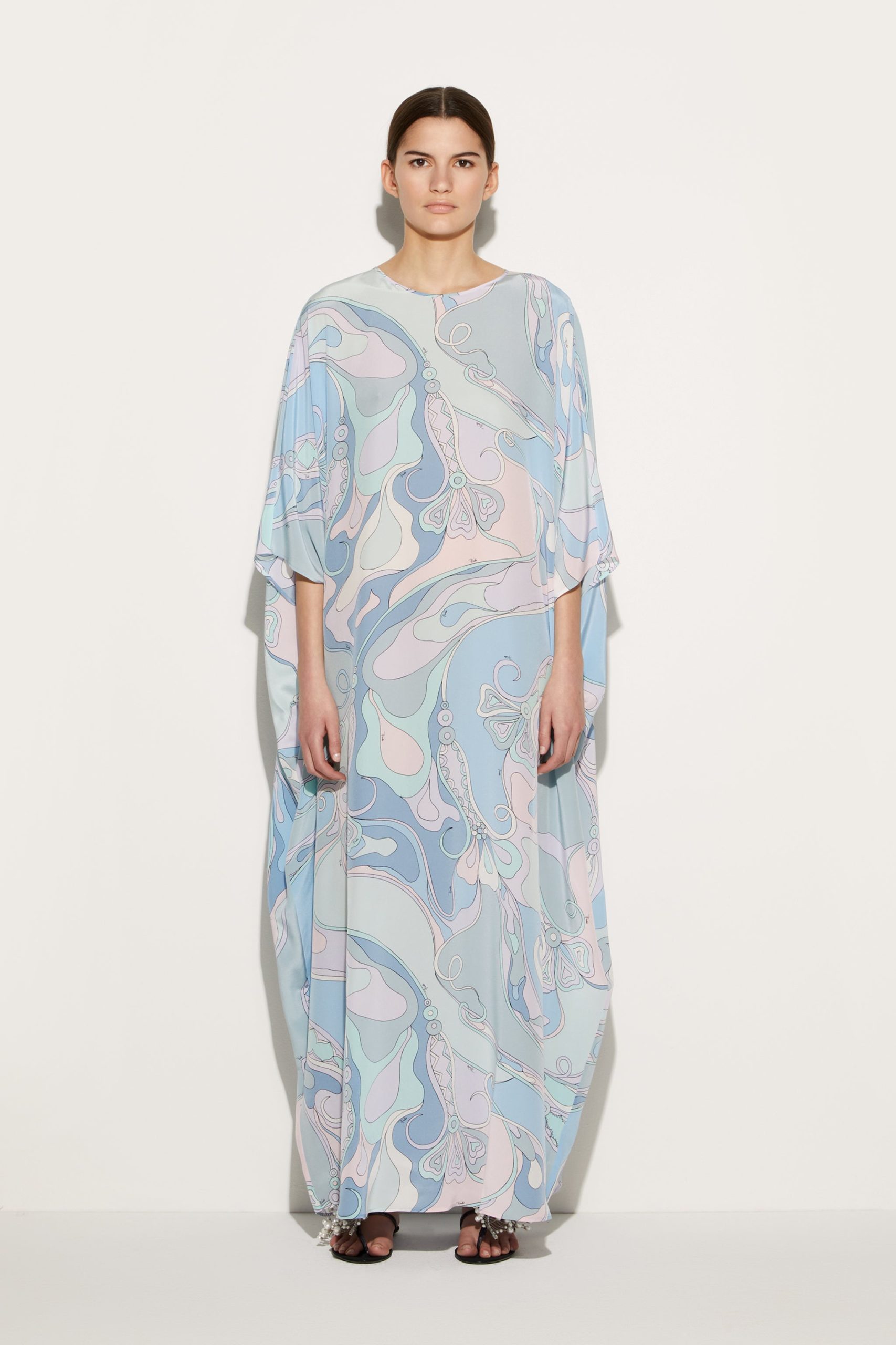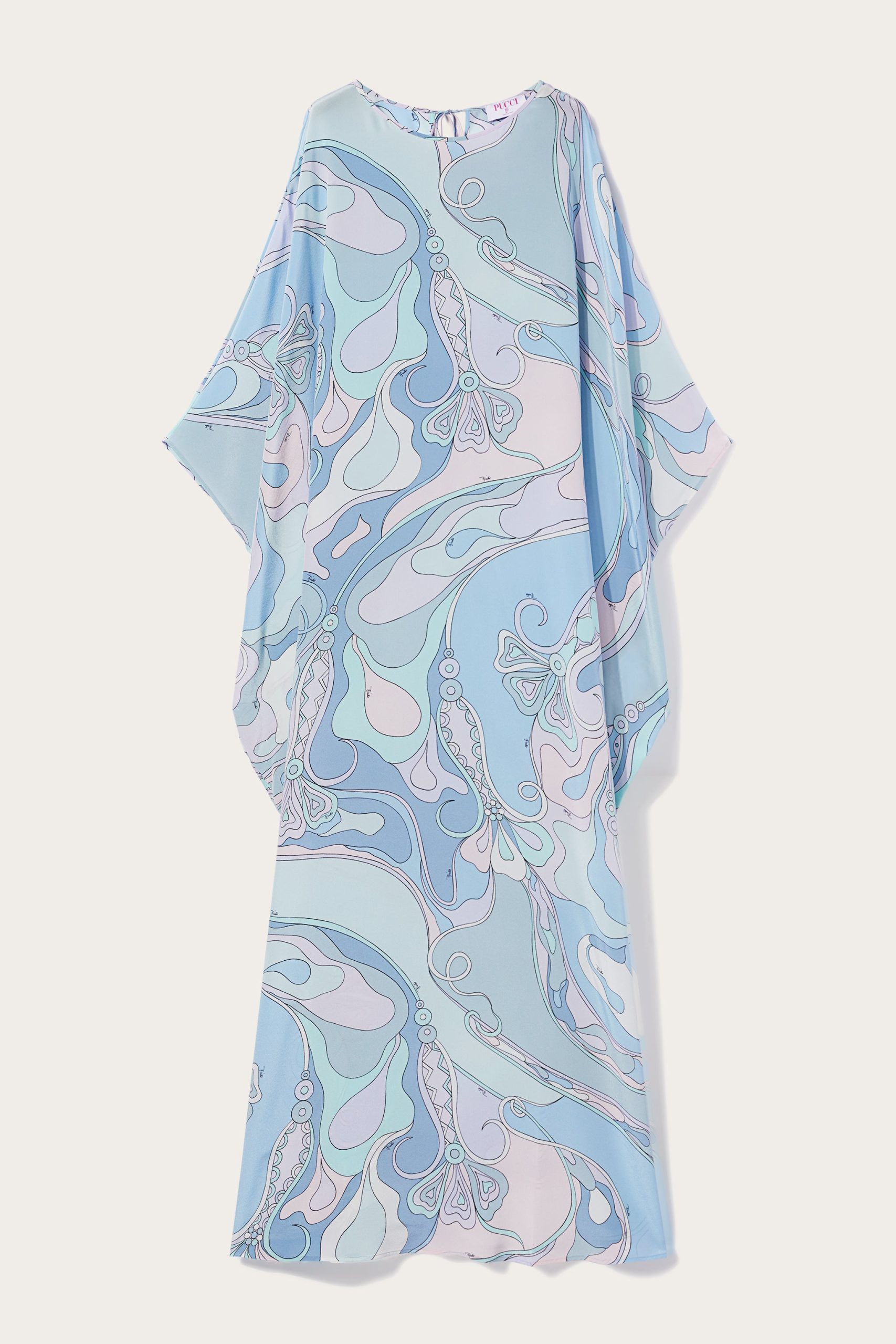 The floral-inspired Orchidee print covers this kaftan dress, rendered in pastel shades of pink and blue. The silk crepe de chine construction and billowing silhouette recall Pucci’s original designs.