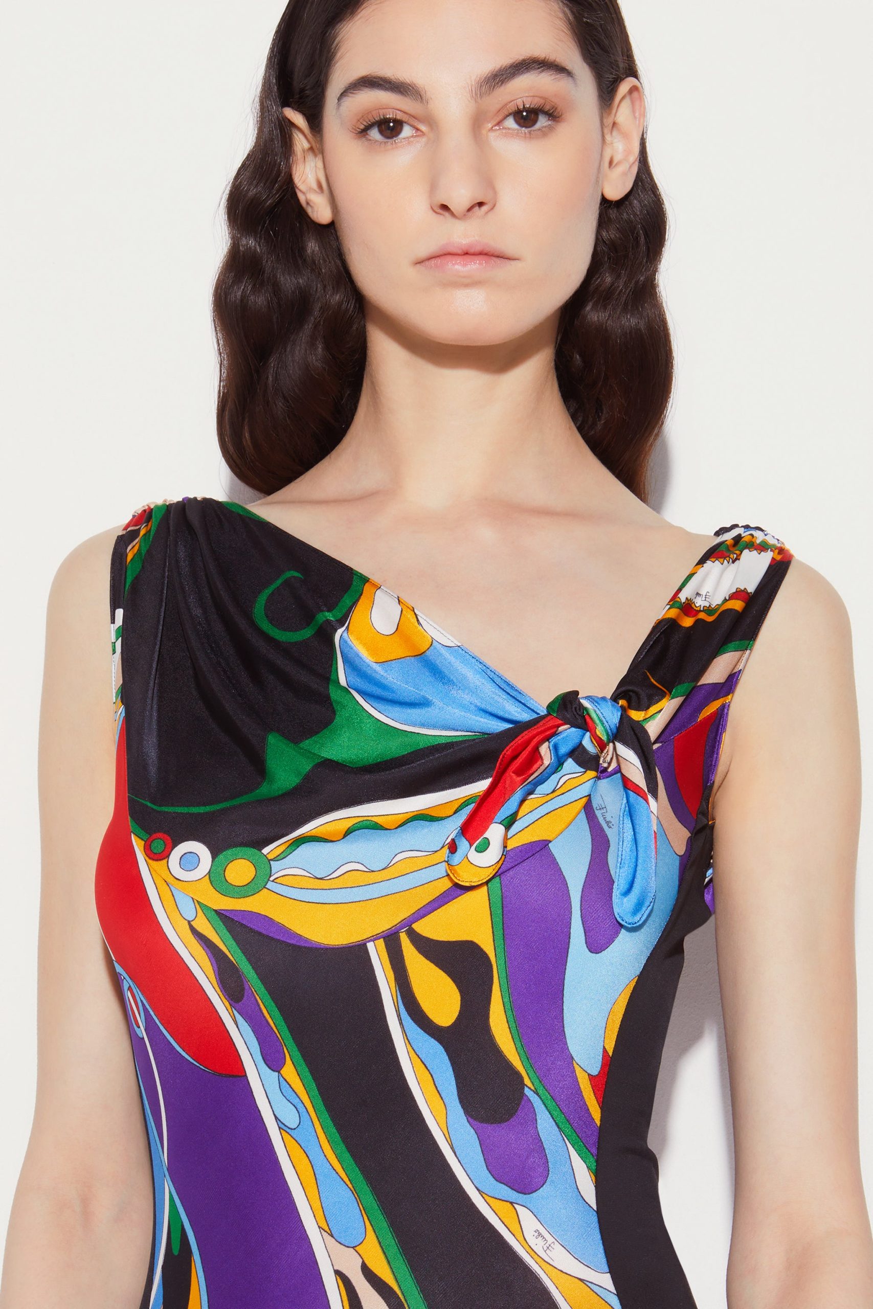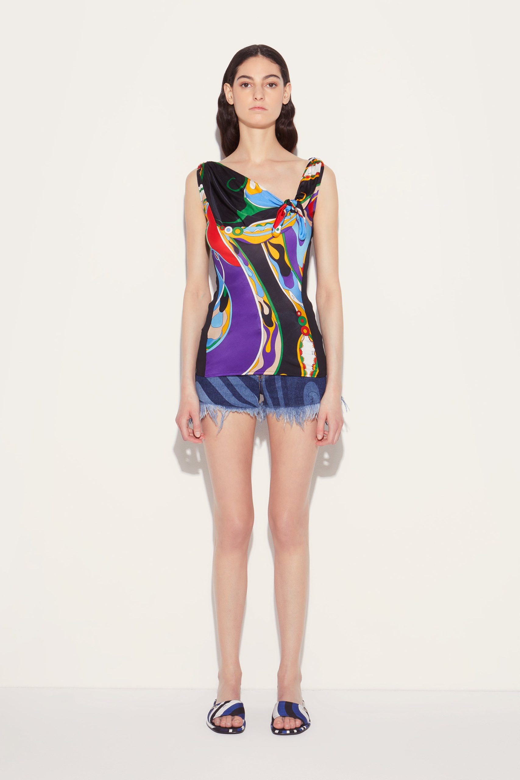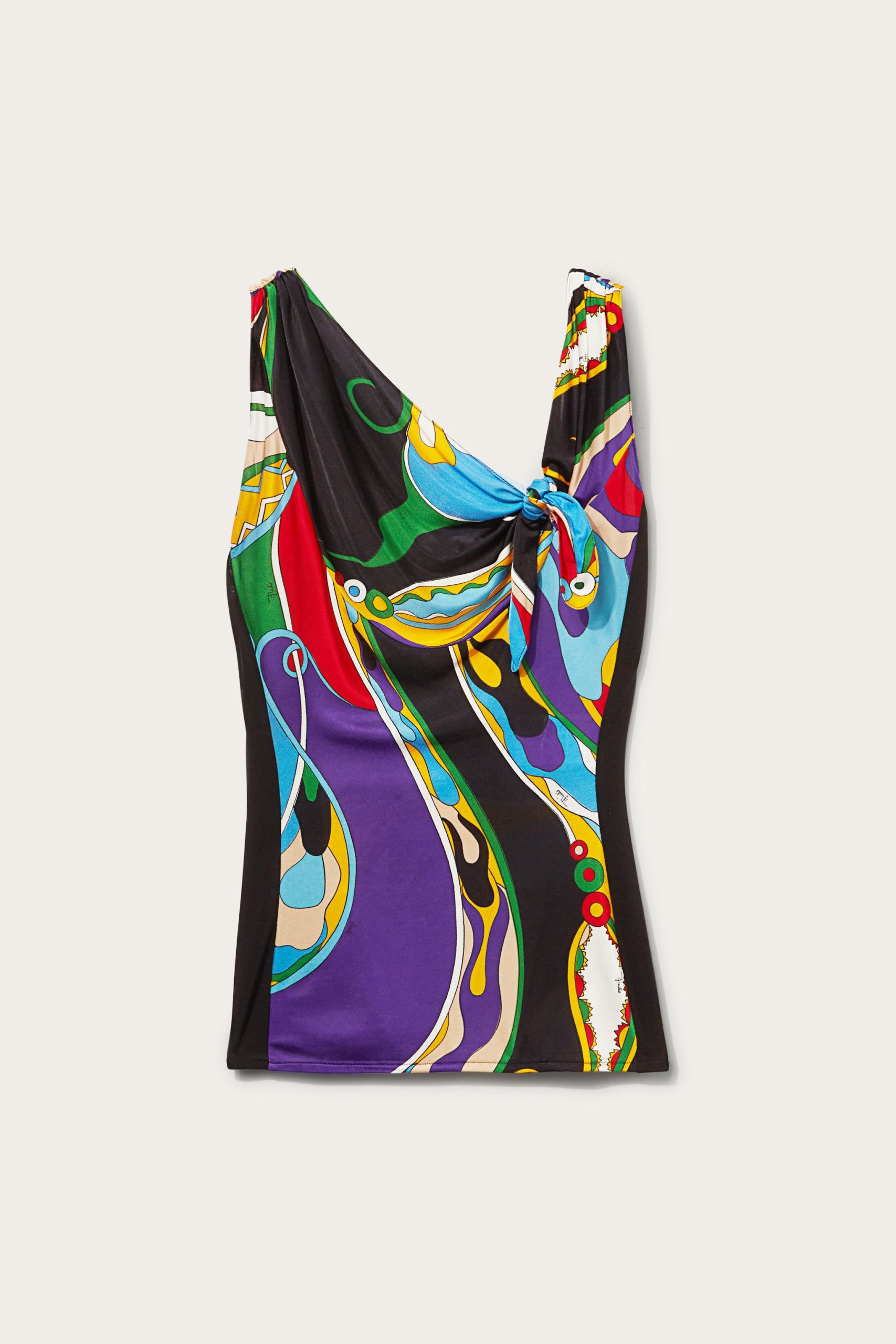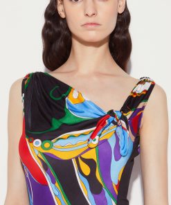 Bringing Pucci’s heritage into the here and now, this top is adorned with Camille Miceli’s interpretation of the archival Orchidee print. A knotted detail at the asymmetric neckline enhances its contemporary appeal.