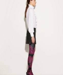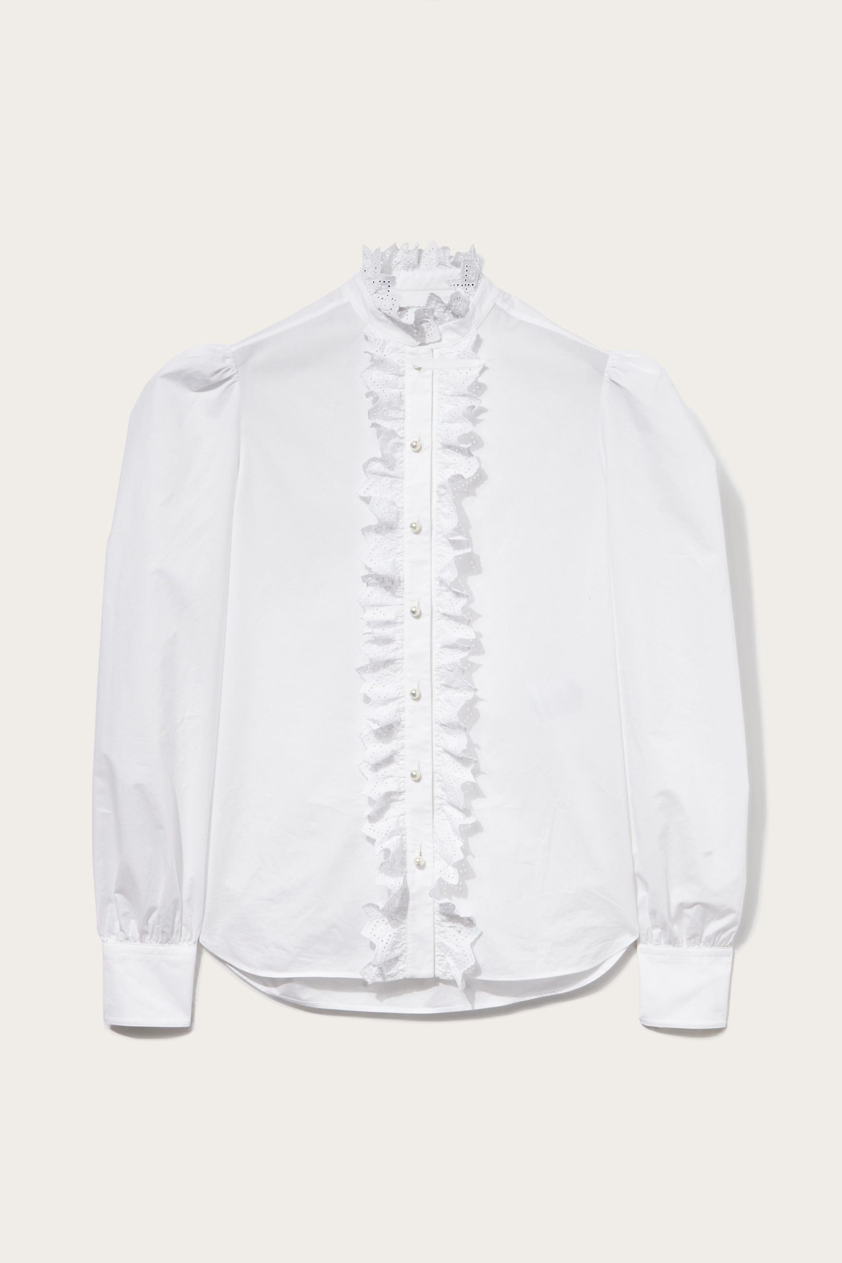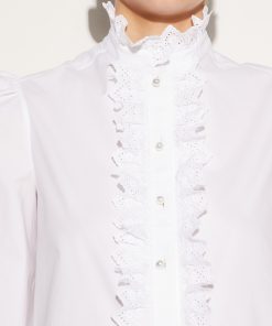 A testament to Pucci’s joyful sensibility, this white shirt is traced with playful broderie anglaise ruffles at the band collar and front fastening. It’s cut from cotton poplin with voluminous puff sleeves that enhance the cheerful mood.