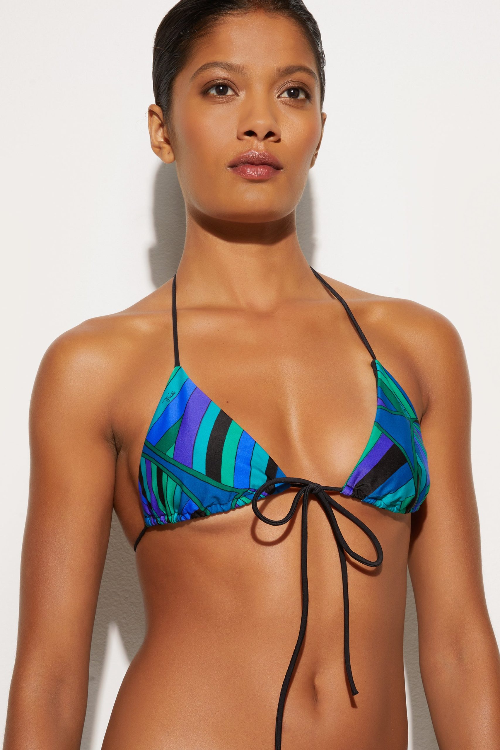 Designed to combine practicality and style, perfect for accompanying you in your moments of relaxation in the sun: this adjustable triangle bra, with fastenings at the neck and in the center, adapts perfectly to any need for comfort and fit. The removable cups allow you to choose the ideal support, making it a versatile garment for any occasion. Made of elastic UV-treated Lycra, this bikini not only guarantees protection from the sun, but also stands out for its elegant Iride print in deep emerald shades. Pair it with the coordinated briefs for a total Pucci look.