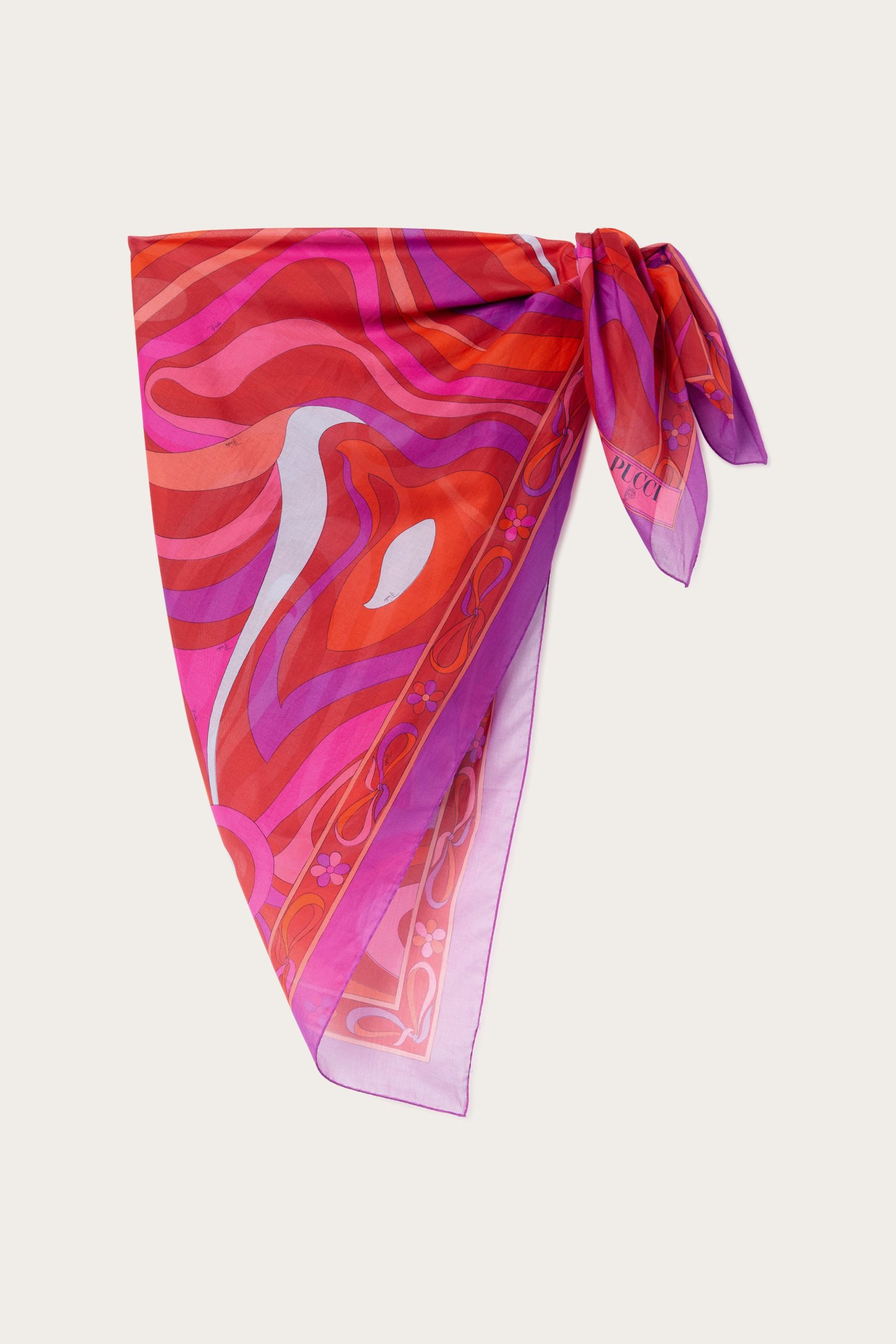 The perfect sarong to accompany you in style during the hottest days. With its light, draped fabric, this sarong lends itself to endless interpretations: knotted at the waist for an elegant beach cover-up. The Marmo print in coral and fuchsia, inspired by the Pucci archives, makes it a true statement piece: elegant, sophisticated and incredibly versatile.